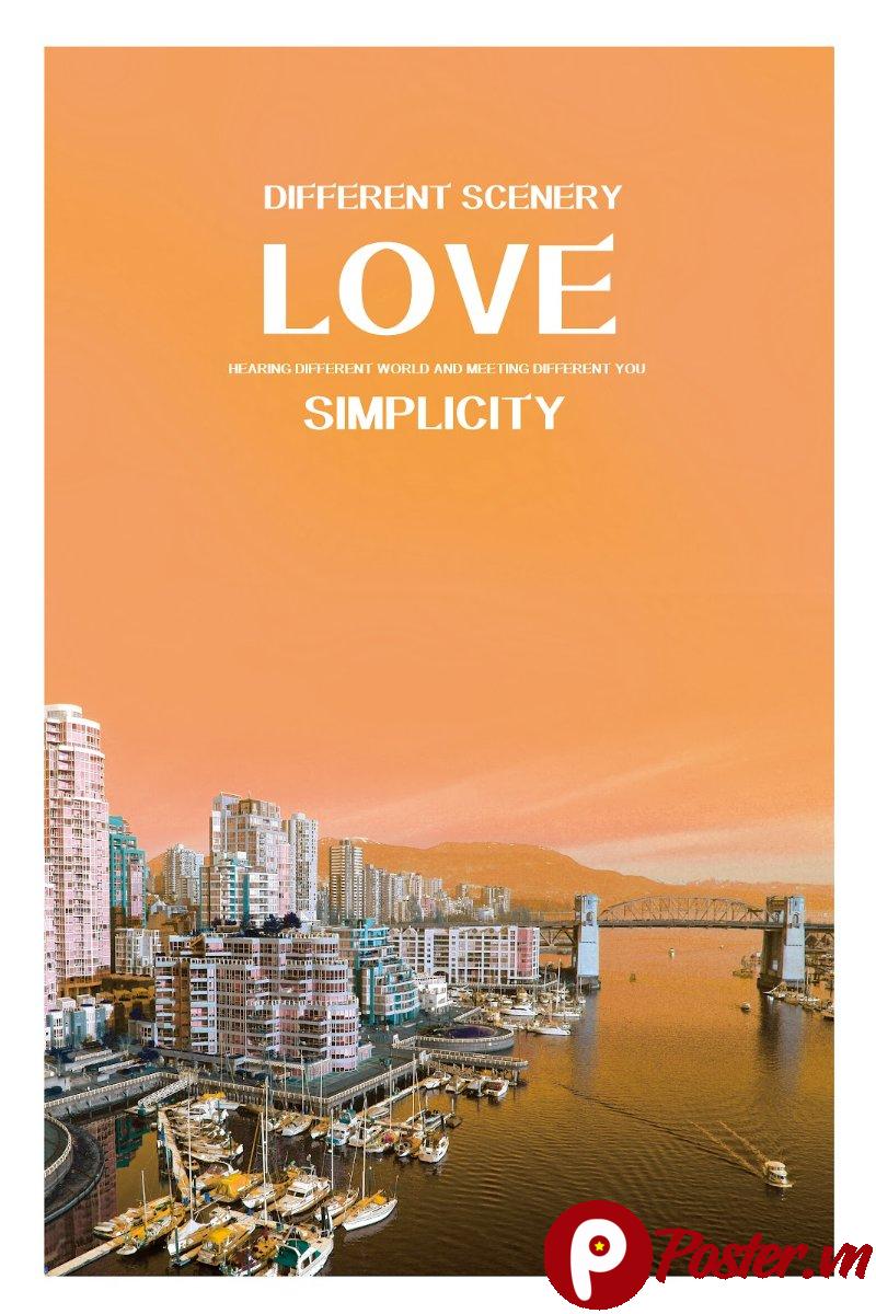 Mẫu poster này nổi bật với bố cục tối giản nhưng đầy tinh tế. Phần trên của poster là một khoảng không gian rộng lớn với tông màu cam chủ đạo, tạo cảm giác ấm áp, bình yên và tràn đầy năng lượng. Các dòng chữ “DIFFERENT SCENERY”, “LOVE”, “SIMPLICITY” được sắp xếp gọn gàng, sử dụng font chữ hiện đại, không chân, nhấn mạnh thông điệp về sự khác biệt, tình yêu và sự đơn giản. Sự tương phản giữa màu cam rực rỡ và màu trắng của chữ tạo nên một điểm nhấn thị giác mạnh mẽ, thu hút ánh nhìn ngay lập tức.