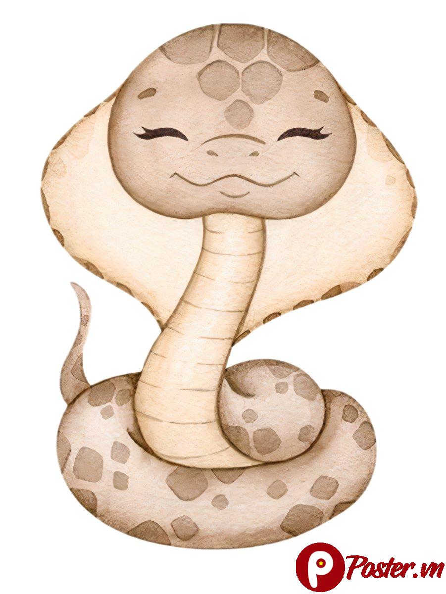 Hình ảnh mô tả một chú rắn hổ mang con với vẻ ngoài cực kỳ đáng yêu. Thay vì vẻ ngoài đáng sợ thường thấy, chú rắn này được thiết kế với đôi mắt nhắm nghiền, nụ cười nhẹ nhàng và chiếc mũ mang đặc trưng của loài hổ mang nhưng được làm mềm mại, tròn trịa. Màu sắc chủ đạo là tông nâu be dịu nhẹ, kết hợp với các đốm vằn tạo nên sự hài hòa và tự nhiên. Phong cách vẽ màu nước mang lại cảm giác mềm mại, ấm áp và gần gũi.