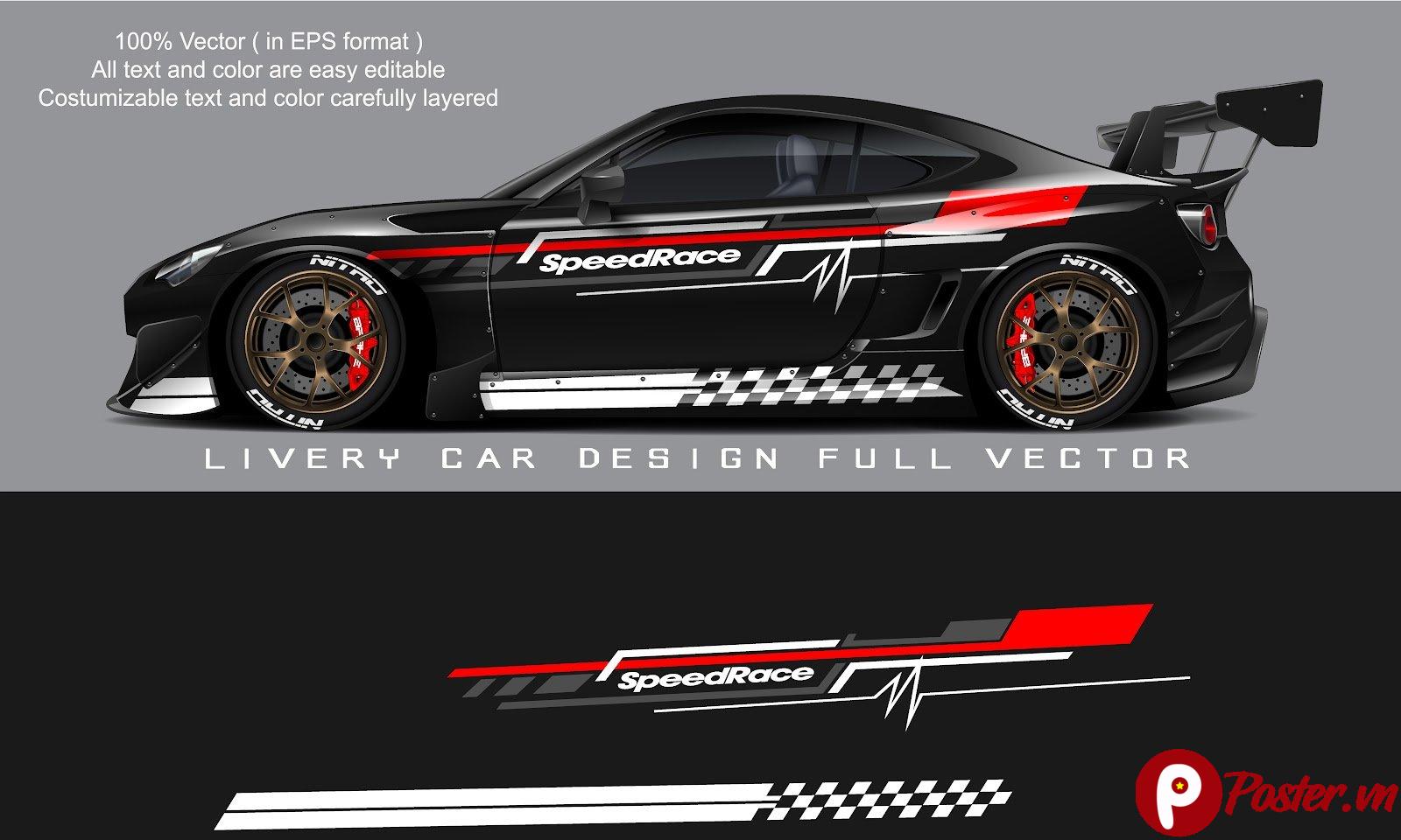 Trong thế giới độ xe và đồ họa quảng cáo, phong cách tem xe đua (livery) luôn chiếm một vị trí quan trọng bởi sự mạnh mẽ, tốc độ và khả năng thu hút ánh nhìn ngay lập tức. Mẫu thiết kế tem xe đua SpeedRace mà Poster.vn giới thiệu hôm nay là một tác phẩm nghệ thuật đồ họa vector đỉnh cao, được thiết kế dành riêng cho những ai đam mê tốc độ và sự cá tính. Với hình ảnh chủ đạo là một chiếc xe ô tô thể thao màu đen bóng bẩy, kết hợp cùng các chi tiết nâng cấp như cánh gió lớn và mâm xe độ, bộ tem này không chỉ đơn thuần là một lớp dán trang trí mà còn là một tuyên ngôn về phong cách sống.
