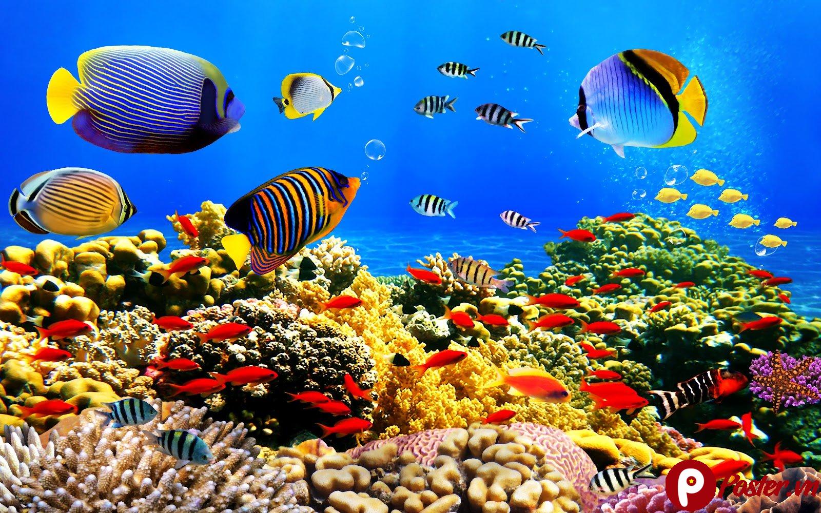 Điểm khác biệt lớn nhất của mẫu tranh này chính là phong cách nhiếp ảnh thiên nhiên cực kỳ sắc nét. Không giống như các hình vẽ vector thông thường, hình ảnh này ghi lại những khoảnh khắc chân thực nhất của thế giới dưới nước. Tông màu chủ đạo là xanh dương thẳm của nước biển sâu, tạo nên một lớp nền tĩnh lặng và bí ẩn. Trên nền xanh ấy, các gam màu nóng như đỏ rực của san hô, vàng chanh của cá bướm, cam của cá hề và tím của các loài thủy sinh khác bừng sáng, tạo nên một bản giao hưởng màu sắc rực rỡ.