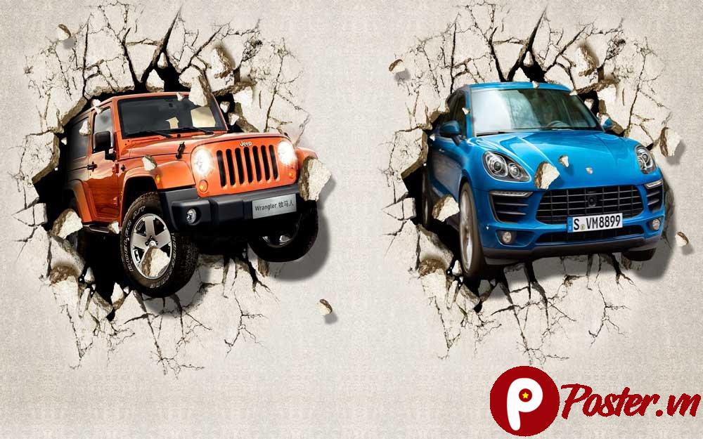 Tranh 3D ô tô vỡ tường tại Poster.vn có nhiều loại xe khác nhau như xe địa hình Jeep, xe thể thao Porsche và nhiều mẫu xe khác, đa dạng về màu sắc và kiểu dáng.