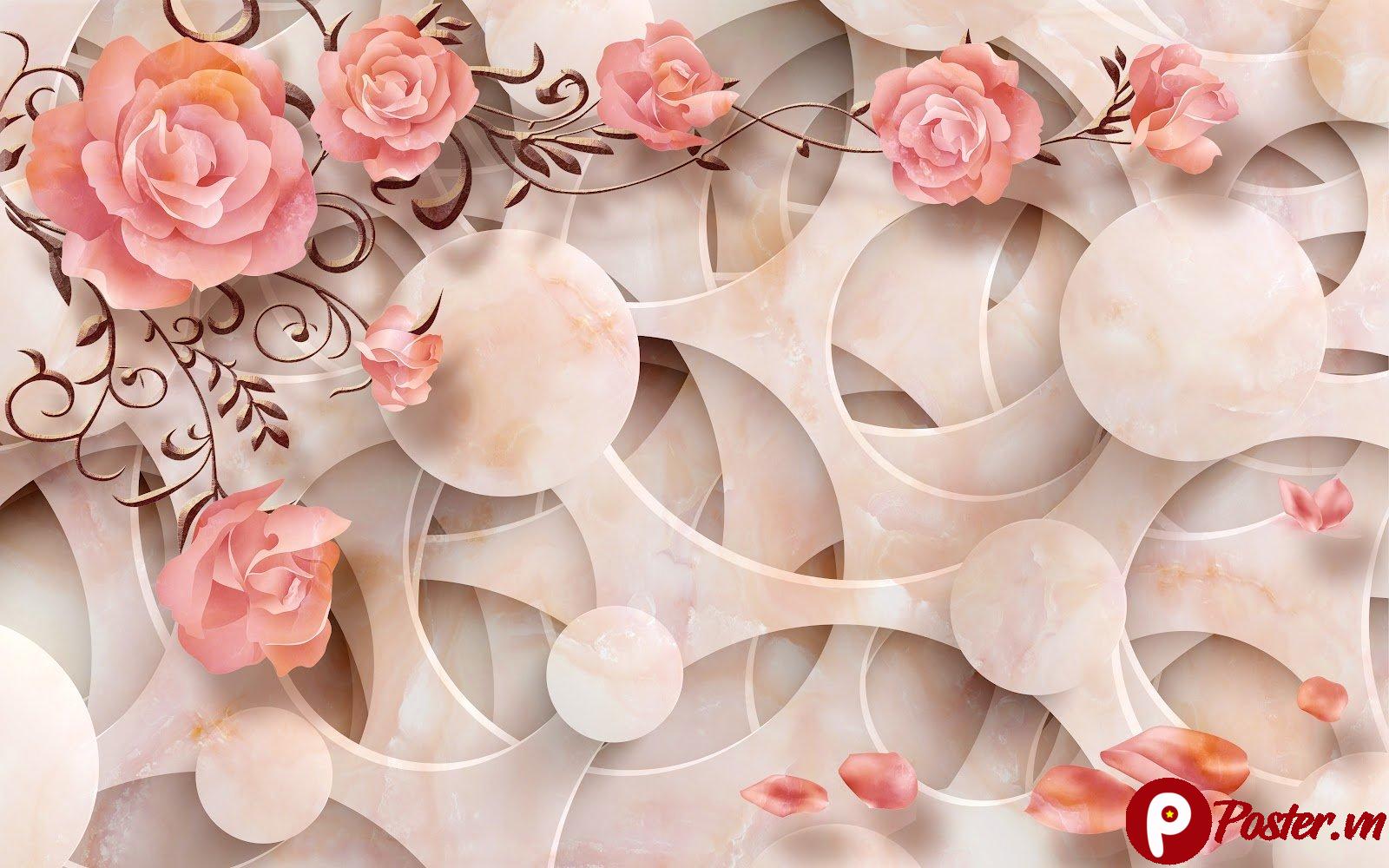 Điểm nhấn của bức tranh chính là những bông hoa hồng đang độ nở rộ với tông màu hồng cam nhẹ nhàng, kết hợp cùng các cành dây leo uốn lượn mềm mại. Toàn bộ bố cục được đặt trên nền các hình khối vòng tròn 3D đan xen và bề mặt vân đá cẩm thạch sang trọng, tạo nên một chiều sâu không gian ấn tượng, giúp căn phòng có cảm giác rộng rãi và thoáng đãng hơn.