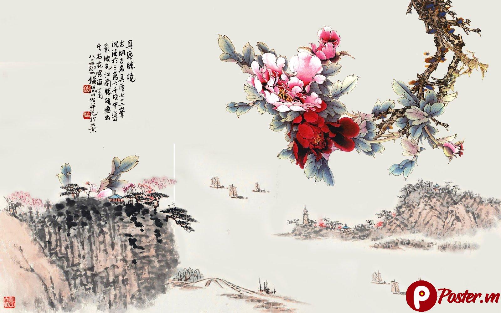 - Màu sắc: Tông màu trung tính của giấy cũ, kết hợp với sắc hồng, đỏ của hoa và xanh trầm của núi non.