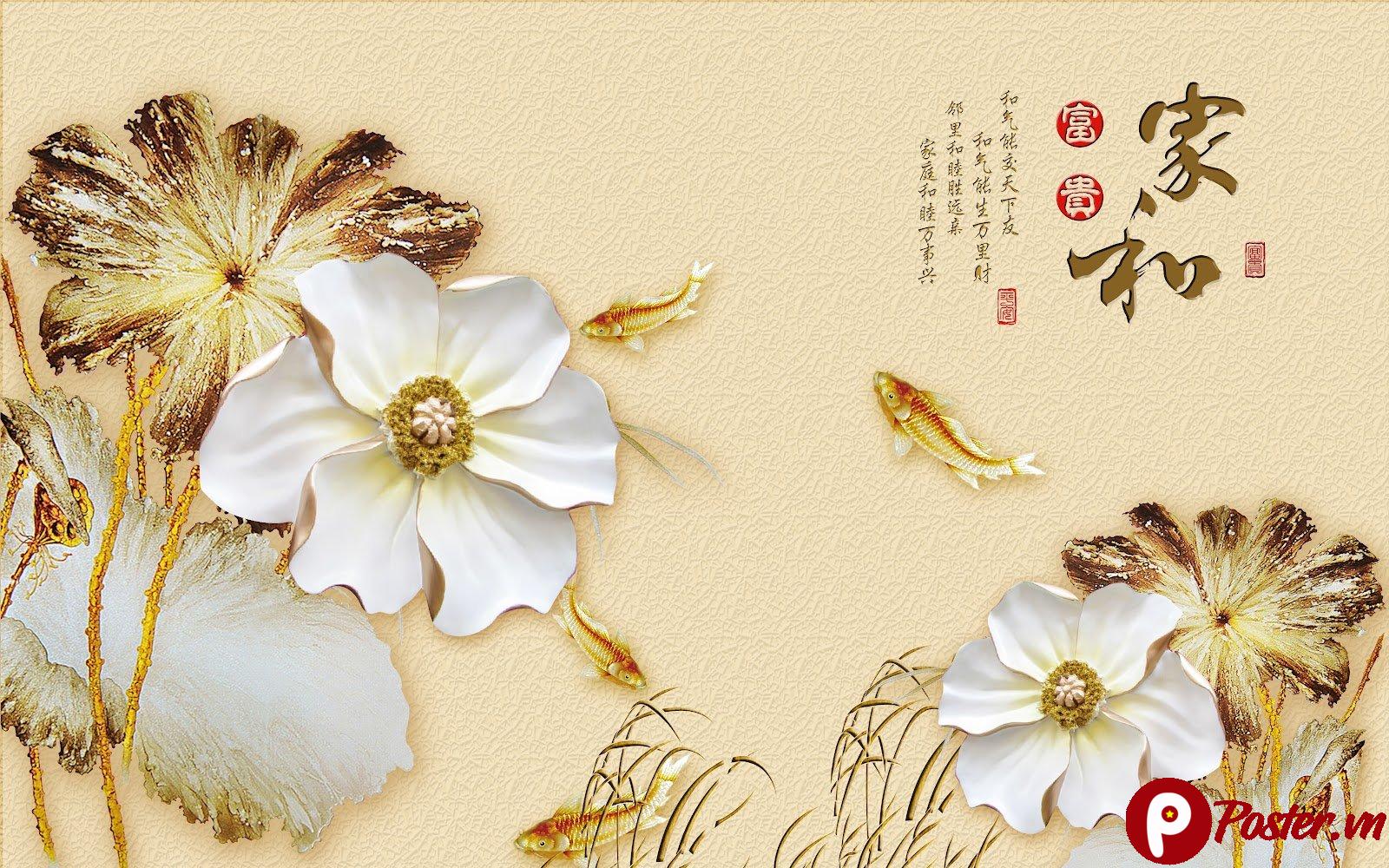Bức tranh nổi bật với sự phối hợp màu sắc tinh tế. Tông màu vàng kim rực rỡ tượng trưng cho sự quyền quý, thịnh vượng được điểm xuyết trên các gân lá sen và đường viền. Những bông hoa trắng tinh khôi nở rộ với các cánh hoa được đổ bóng 3D tinh vi, tạo nên cảm giác mềm mại nhưng vô cùng vững chãi như được tạc từ đá quý. Đàn cá chép bơi lội quanh những đóa sen tạo ra một nhịp điệu chuyển động hài hòa, làm giảm bớt sự cứng nhắc của các mảng khối đá và gỗ. Ngoài ra, việc bổ sung các dòng chữ thư pháp và ấn triện đỏ ở góc phải không chỉ làm cân bằng bố cục mà còn khẳng định giá trị nghệ thuật truyền thống, giúp bức tranh có thêm ‘hồn’ và sự trang nghiêm.