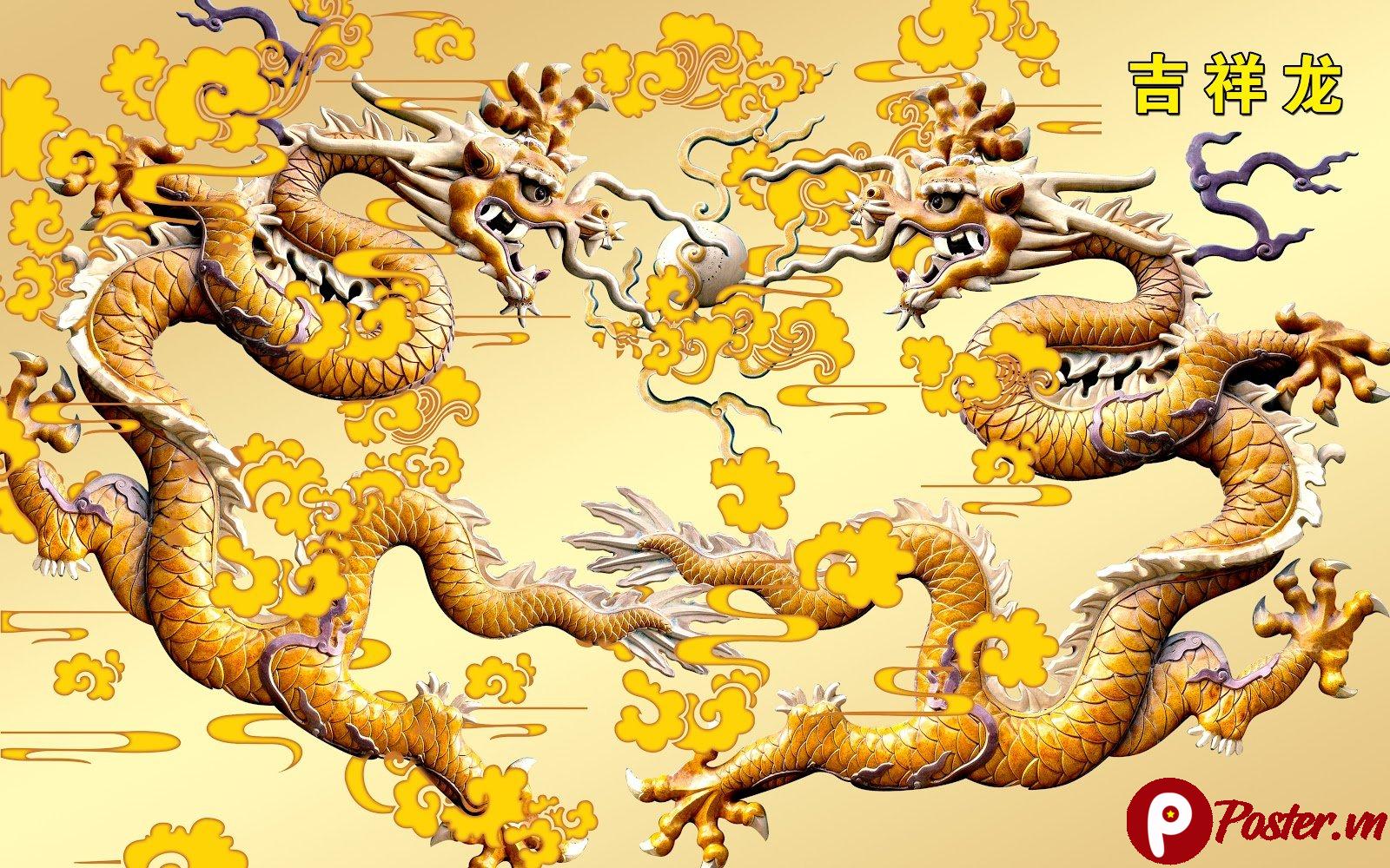 Tác phẩm tái hiện hình ảnh hai con rồng vàng uốn lượn đối xứng, vây quanh một viên ngọc rực rỡ ở giữa những đám mây cách điệu. Toàn bộ bức tranh toát lên vẻ sang trọng với tông màu vàng kim chủ đạo, mang lại cảm giác ấm cúng và quyền quý cho không gian sở hữu. Đây không chỉ là một file thiết kế, mà còn là một tư liệu quý giá cho các nhà thiết kế nội thất và các xưởng in ấn tranh khổ lớn.