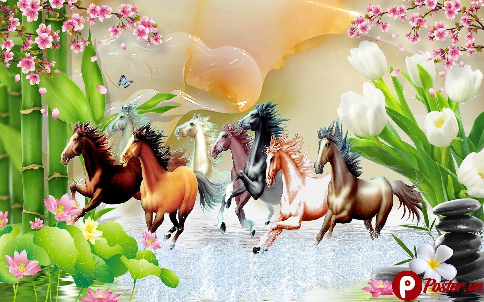 - Màu sắc rực rỡ, hài hòa: Sự kết hợp tinh tế giữa màu xanh lá tươi mát của tre và lá sen, sắc hồng lãng mạn của hoa anh đào và sen, trắng tinh khôi của hoa tulip và bọt nước, cùng với tông màu nâu, vàng cam mạnh mẽ của ngựa và nền trời. Các điểm nhấn xanh dương và đen càng làm bức tranh thêm phần sống động, cân bằng.