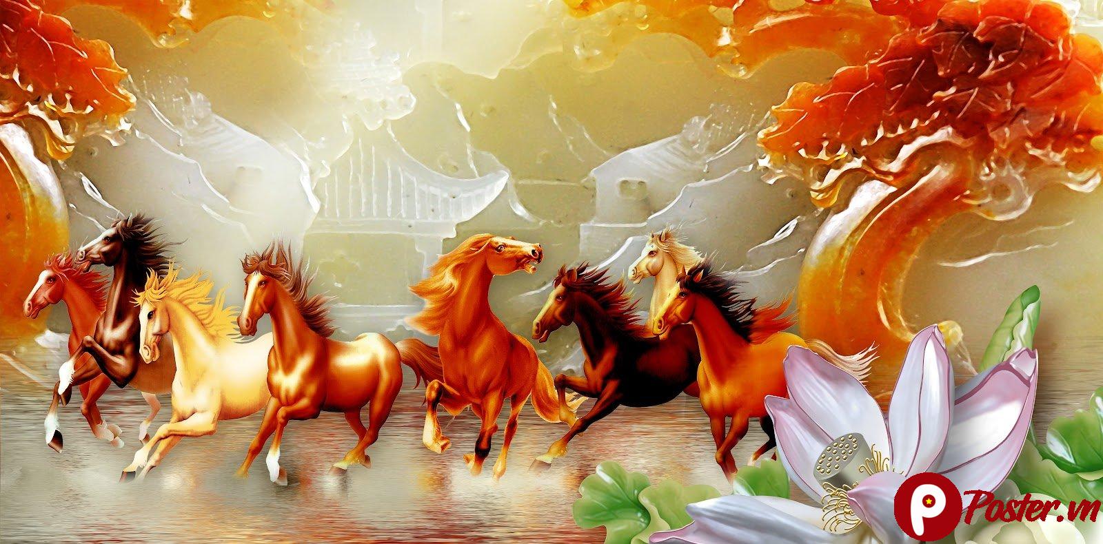 - Đàn Ngựa Mã Đáo Thành Công Đầy Khí Thế: Tám con ngựa phi nước đại mạnh mẽ là linh hồn của bức tranh, biểu tượng cho tốc độ, sức mạnh, sự kiên trì và mang ý nghĩa “Mã Đáo Thành Công” – quay về thắng lợi, đạt được mục tiêu. Số 8 trong phong thủy cũng là con số của sự phát đạt, thịnh vượng (phát tài). Đàn ngựa được thể hiện với màu lông đa dạng, từ nâu sẫm, vàng óng đến trắng ngà, bờm và đuôi tung bay trong gió, tạo cảm giác chuyển động sống động và năng lượng dồi dào.