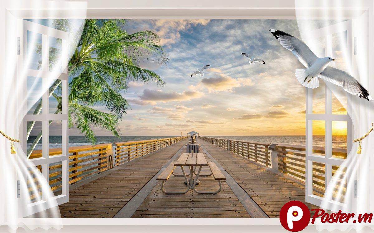 Tranh Phong Cảnh Biển Đẹp Qua Cửa Sổ. Khám phá bộ sưu tập tranh phong cảnh biển đẹp, ấn tượng với hình ảnh bãi biển, hoàng hôn và cầu cảng qua khung cửa sổ mở, mang đến vẻ đẹp sống động, tươi mới cho không gian của bạn.