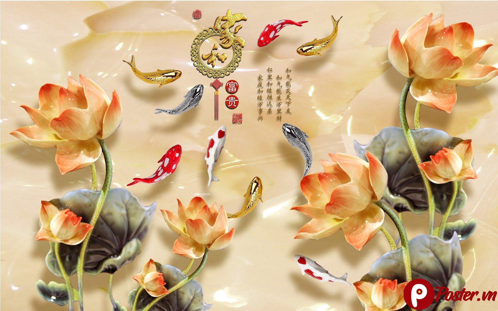 Điểm khác biệt lớn nhất của mẫu tranh này chính là hiệu ứng thị giác 3D cực kỳ mạnh mẽ. Nhìn vào bức tranh, bạn sẽ có cảm giác như các cánh hoa sen đang vươn ra khỏi bề mặt, hay đàn cá chép đang thực sự quẫy đuôi trong làn nước. Kỹ thuật giả lập khảm đá (stone inlay) và khảm gỗ (wood inlay) mang lại vẻ đẹp cổ điển, quý tộc. Các họa tiết trang trí xung quanh và những dòng chữ thư pháp được bố trí hài hòa, tạo nên một bố cục cân xứng, vững chãi. Màu sắc vàng kem nhã nhặn không chỉ làm nổi bật các chủ thể chính mà còn dễ dàng phối hợp với nhiều phong cách nội thất từ Tân cổ điển đến Hiện đại.