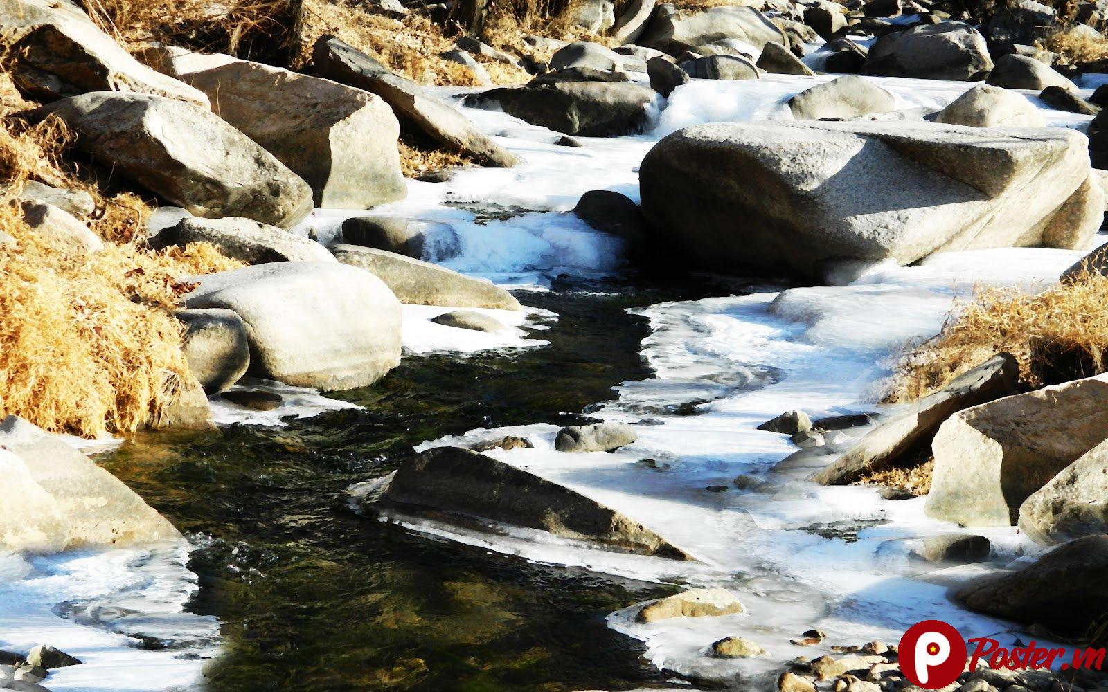 Điểm thu hút đầu tiên của bức tranh chính là bảng màu độc đáo. Sự kết hợp giữa màu trắng tinh khôi của băng tuyết, màu xám lạnh của những tảng đá lớn và sắc vàng nâu của cỏ khô ven bờ tạo nên một bản giao hưởng màu sắc đầy tính nghệ thuật. Màu đen thẫm của dòng nước len lỏi giữa các kẽ đá đóng vai trò như một điểm nhấn, tạo ra sự cân bằng cho toàn bộ bố cục. Ánh sáng trong tranh được xử lý tuyệt vời; ánh nắng gắt chiếu trực diện tạo ra những mảng sáng tối rõ rệt, giúp các khối đá và lớp tuyết hiện lên vô cùng nổi bật và có khối. Con suối nhỏ chảy giữa mùa đông lạnh giá là hình ảnh trung tâm, tượng trưng cho sức sống bền bỉ, không bao giờ ngừng nghỉ ngay cả trong điều kiện khắc nghiệt nhất. Về mặt kỹ thuật, độ sắc nét của file 20MB cho phép người dùng quan sát rõ từng sợi cỏ khô hay từng vết rạn trên bề mặt tảng đá.