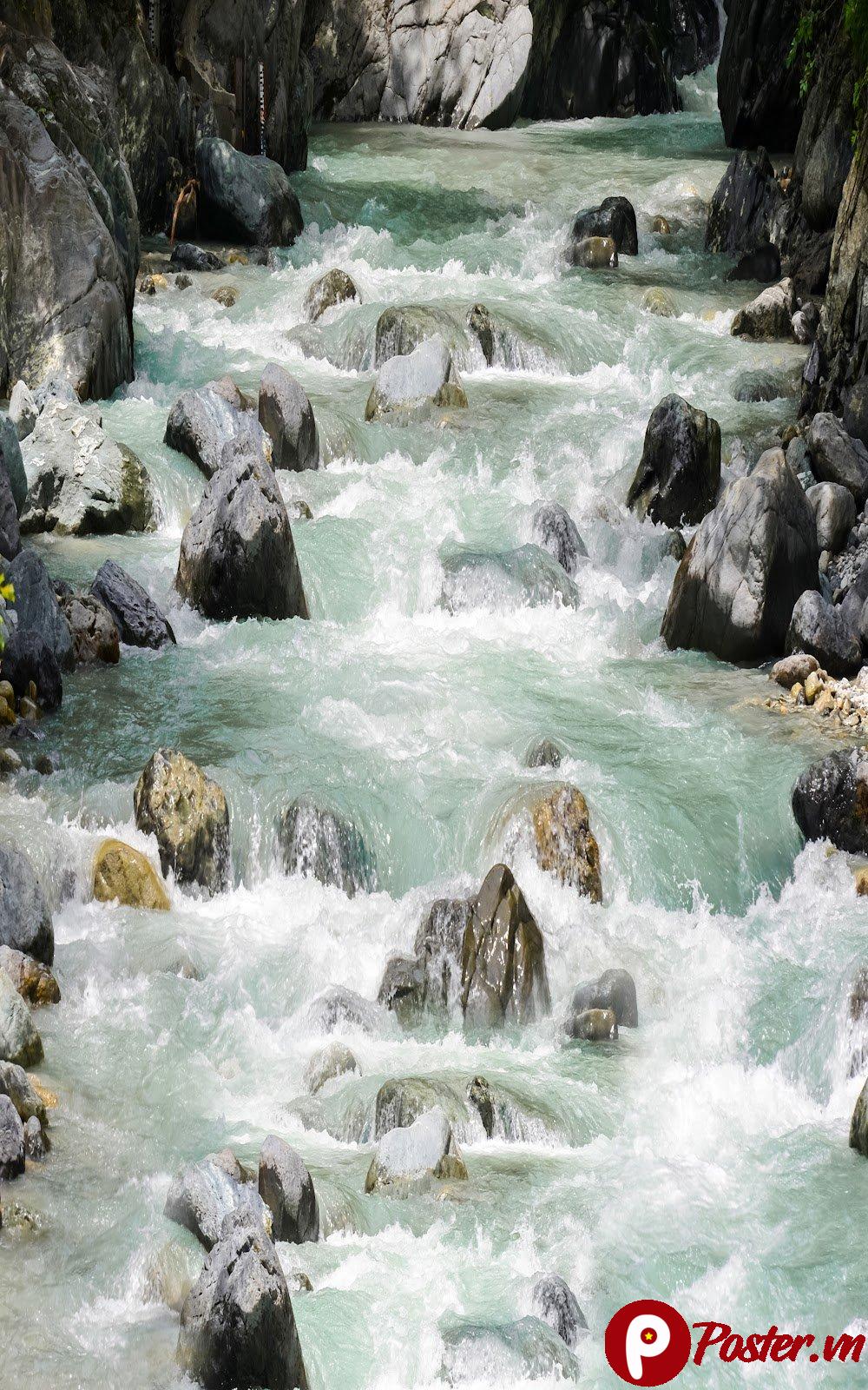 Sự kết hợp giữa sắc xanh ngọc bích của làn nước và tông xám trầm của đá tạo nên một sự tương phản đầy tính thẩm mỹ. Trong phong thủy, nước tượng trưng cho tài lộc, sự luân chuyển không ngừng của dòng nước giữa khe núi đại diện cho dòng chảy tiền tài và may mắn vào nhà. Đây là lý do khiến các kiến trúc sư và nhà thiết kế nội thất luôn ưu tiên sử dụng các hình ảnh sơn thủy để làm điểm nhấn cho các công trình của mình.