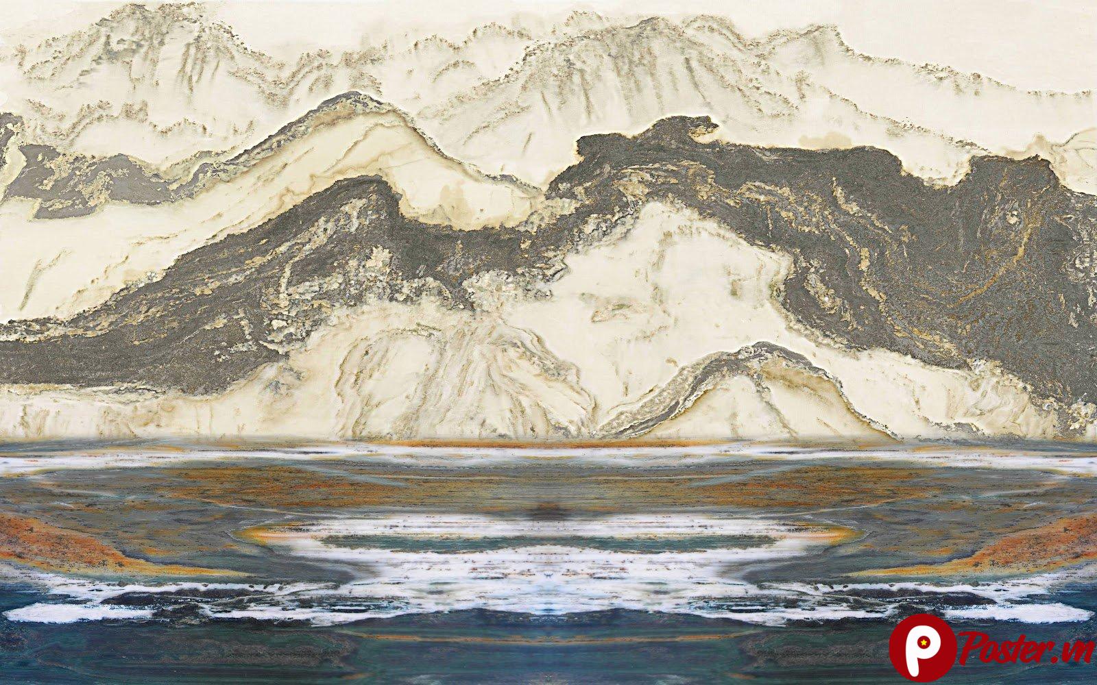 Tranh Vân Đá Trừu Tượng Đẹp: Mẫu tranh vân đá trừu tượng với phong cách thủy mặc hiện đại, dung hòa giữa nét hùng vĩ của núi non và sự tĩnh lặng của nước, phù hợp cho trang trí nội thất cao cấp.