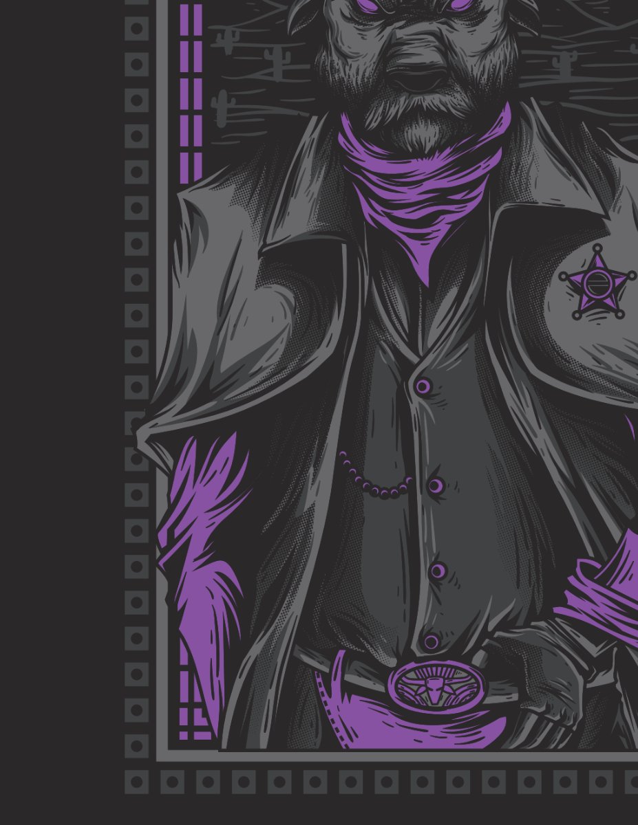 Hình ảnh vector cao bồi quỷ dữ này được thiết kế với sự kết hợp hài hòa giữa nét cổ điển của miền Tây hoang dã và yếu tố huyền bí, mạnh mẽ. Nhân vật cao bồi được khắc họa với vẻ ngoài gai góc, bí ẩn, cùng với những chi tiết ma mị, tạo nên một tổng thể đầy cuốn hút. Màu sắc chủ đạo là tông trầm như đen, xám, kết hợp với các điểm nhấn màu tím nổi bật, càng làm tăng thêm sự bí ẩn và quyền lực cho thiết kế.