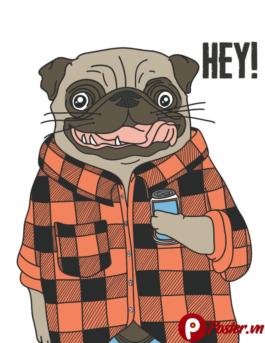 Hình ảnh mô tả một chú chó Pug với biểu cảm vui tươi, lè lưỡi đáng yêu, đang mặc một chiếc áo sơ mi kẻ caro màu cam và xanh. Chú chó còn cầm một lon nước, tạo nên một phong cách rất “cool” và gần gũi. Dòng chữ “HEY!” ở góc trên bên phải càng tăng thêm sự tương tác và cá tính cho hình ảnh.