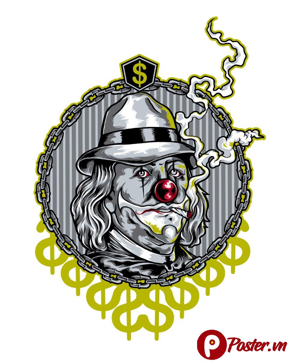 Thiết kế này mang đậm phong cách street art và gangster, với sự kết hợp giữa hình ảnh chú hề truyền thống và các yếu tố hiện đại, mạnh mẽ. Màu sắc chủ đạo là đen, trắng, xám, vàng và đỏ, tạo nên sự tương phản mạnh mẽ và thu hút ánh nhìn. Sự kết hợp này không chỉ tạo ra một hình ảnh ấn tượng mà còn truyền tải nhiều thông điệp ẩn dụ về xã hội, tiền bạc và con người.