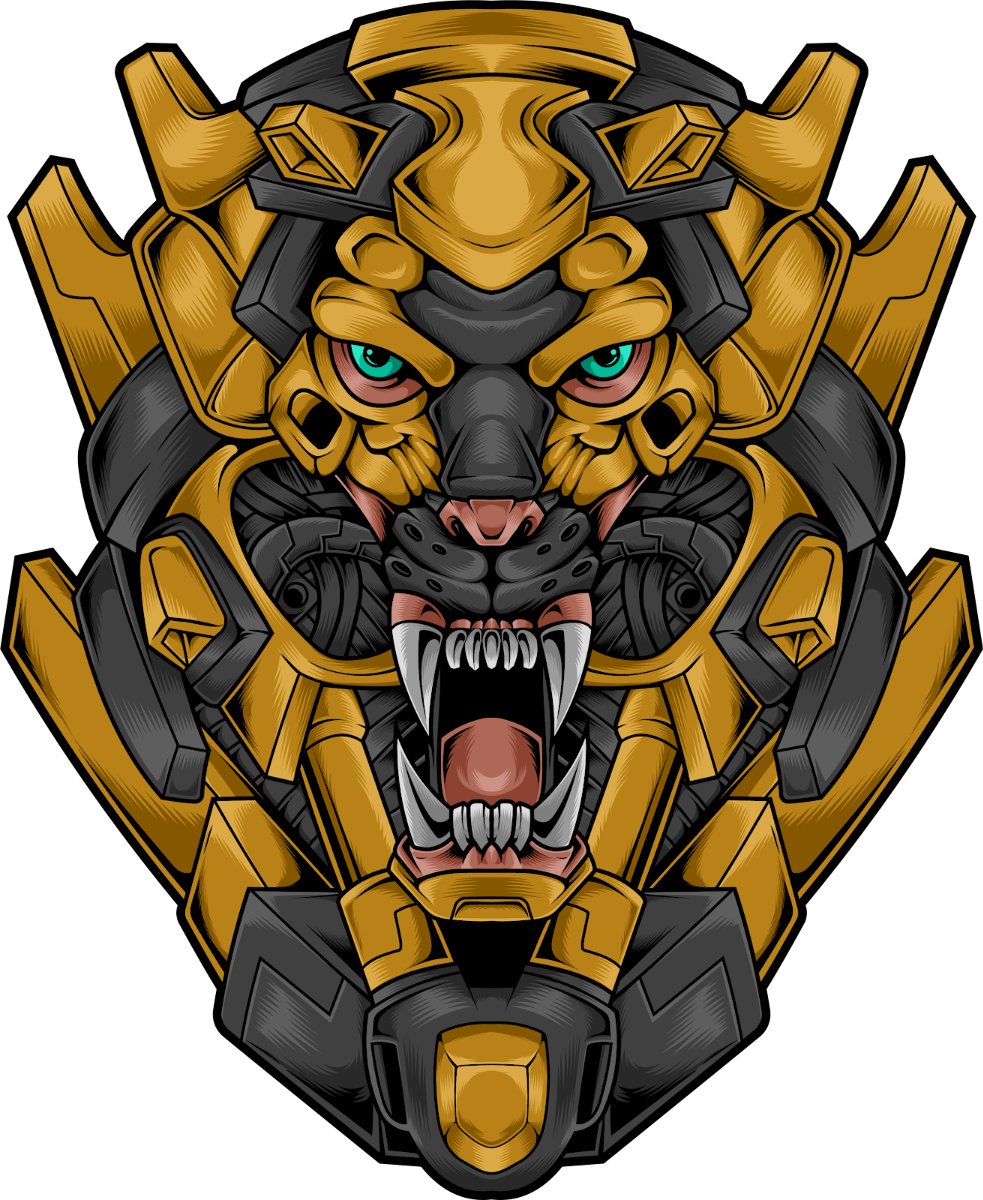Mẫu vector này không chỉ đơn thuần là một hình ảnh, mà là một tuyên ngôn về sức mạnh và phong cách. Sự kết hợp giữa hình ảnh chúa sơn lâm dũng mãnh và các chi tiết cơ khí hiện đại tạo nên một tác phẩm nghệ thuật đầy ấn tượng. Tông màu vàng kim loại sang trọng kết hợp với màu đen huyền bí làm nổi bật từng đường nét, từng chi tiết robot phức tạp trên khuôn mặt hổ.