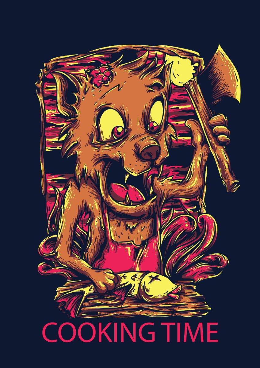 Bạn đang tìm kiếm một thiết kế đồ họa độc đáo, phá cách và đầy ấn tượng? Vector “Cooking Time” với phong cách kinh dị chắc chắn sẽ làm hài lòng những ai yêu thích sự khác biệt. Với hình ảnh một chú chó sói đầu bếp cầm rìu, cùng con cá bị xẻ thịt, thiết kế này không chỉ thu hút mọi ánh nhìn mà còn gợi lên nhiều cảm xúc mạnh mẽ. Hãy cùng Poster.vn khám phá chi tiết về tài nguyên đồ họa đặc biệt này.