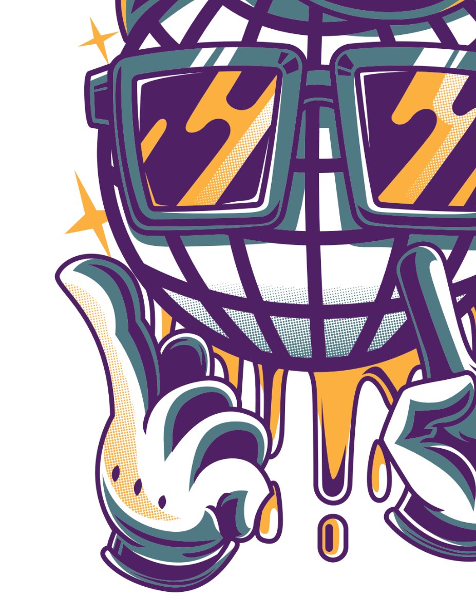 Hình ảnh vector này mô tả một nhân vật đầu tròn, đeo kính râm sành điệu và tai nghe (headphone) cực chất, với biểu cảm vui tươi và ngón tay cái giơ lên thể hiện sự “cool ngầu”. Các chi tiết được thiết kế theo phong cách graffiti, với những đường nét mạnh mẽ, màu sắc tương phản nổi bật như tím, vàng và xanh ngọc, tạo nên một tổng thể vô cùng bắt mắt và cá tính.