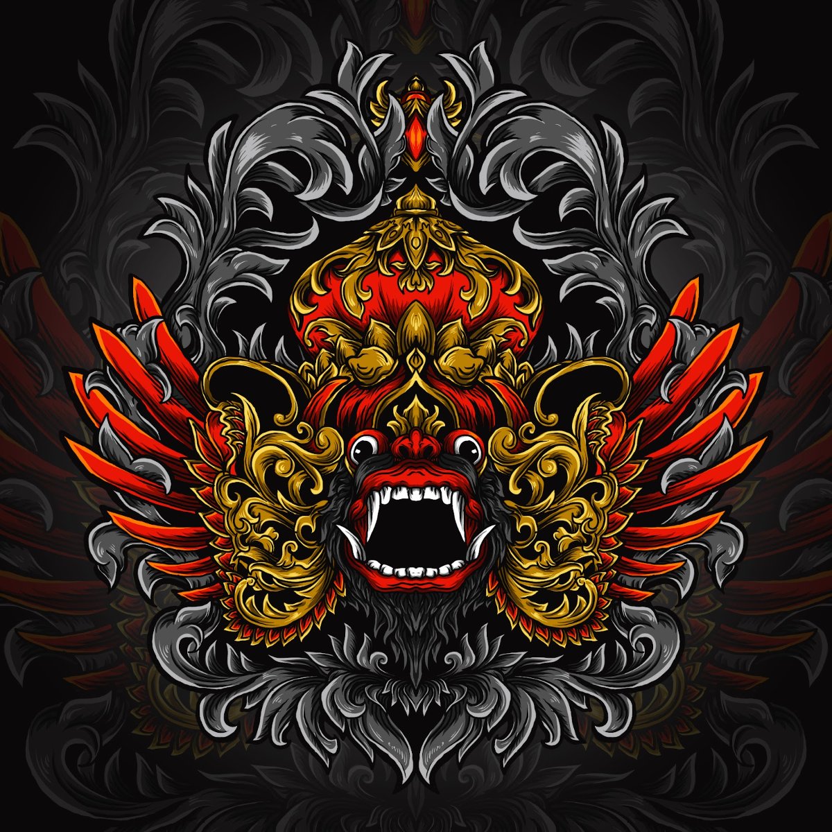 Mẫu thiết kế này mang phong cách đồ họa minh họa chi tiết, kết hợp giữa yếu tố truyền thống Bali và nét hiện đại trong cách phối màu và đổ bóng. Sự kết hợp giữa các họa tiết chạm khắc truyền thống, hình ảnh Garuda và Barong uy nghi, cùng với bảng màu đỏ, vàng kim và xám tạo nên một tác phẩm vừa mang tính nghệ thuật cao, vừa có sức hút mạnh mẽ. Đây là lựa chọn lý tưởng cho những ai yêu thích văn hóa Á Đông, nghệ thuật tâm linh hoặc muốn tạo ra những sản phẩm có phong cách độc đáo, mạnh mẽ và đầy cá tính.
