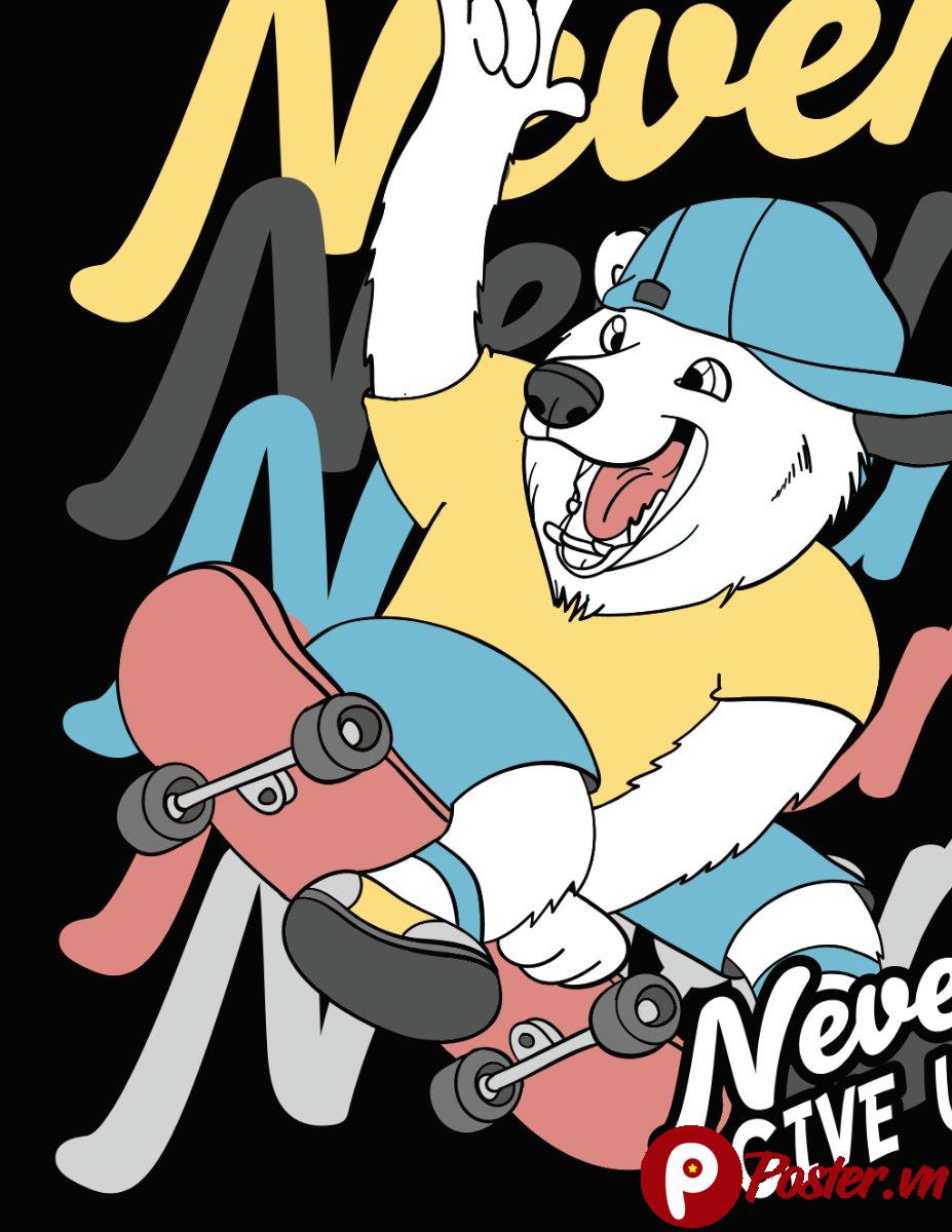 Hình ảnh chú gấu Bắc Cực đội mũ lưỡi trai, mặc áo phông và quần short, đang thực hiện cú trượt ván điệu nghệ, toát lên một phong thái cực kỳ ngầu và tự tin. Với dòng chữ “Never Give Up” (Không bao giờ bỏ cuộc) được lồng ghép khéo léo, thiết kế này không chỉ mang tính thẩm mỹ cao mà còn truyền tải một thông điệp tích cực, khuyến khích tinh thần kiên trì và vượt qua thử thách.