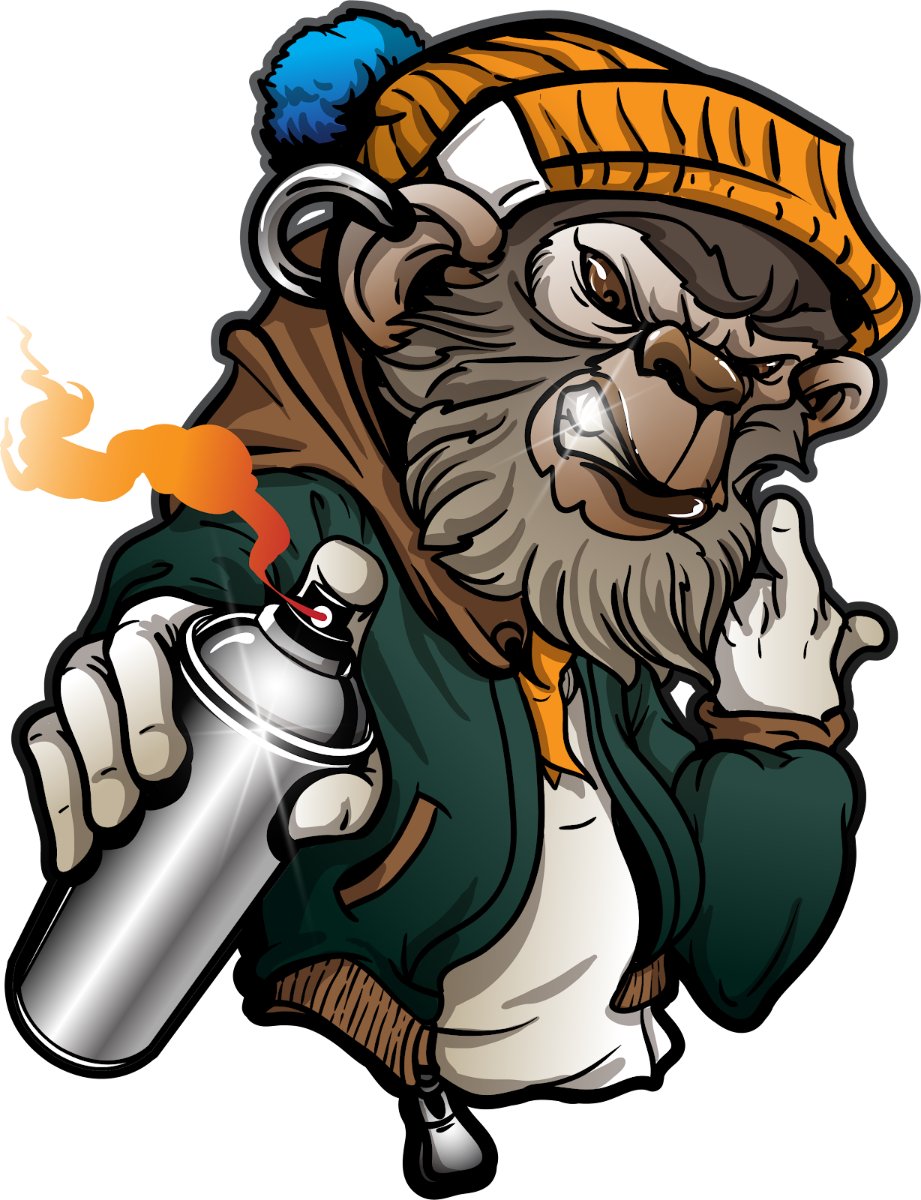 Hình ảnh chú khỉ với phong cách graffiti mạnh mẽ, đội mũ len cá tính và cầm bình xịt sơn, thể hiện rõ tinh thần tự do, phá cách của nghệ thuật đường phố. Với đôi mắt sắc sảo và biểu cảm đầy thách thức, thiết kế này chắc chắn sẽ làm nổi bật bất kỳ dự án nào của bạn.