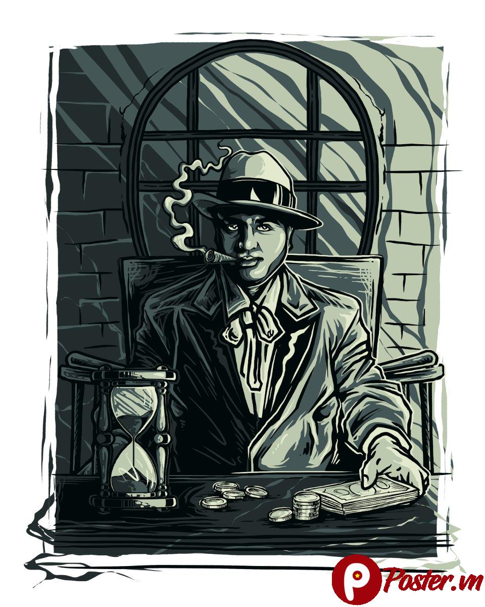 Hình ảnh vector này khắc họa một người đàn ông trong trang phục mafia cổ điển, đội mũ phớt, đeo cà vạt và đang thưởng thức điếu xì gà. Khuôn mặt của ông toát lên vẻ lạnh lùng, quyết đoán, ẩn chứa nhiều câu chuyện. Phía trước là bàn với đồng tiền xu và một chiếc đồng hồ cát, biểu tượng của thời gian và sự giàu có. Bối cảnh phía sau là một căn phòng tối với cửa sổ vòm, tạo nên không khí u ám, bí ẩn đặc trưng của thế giới ngầm.