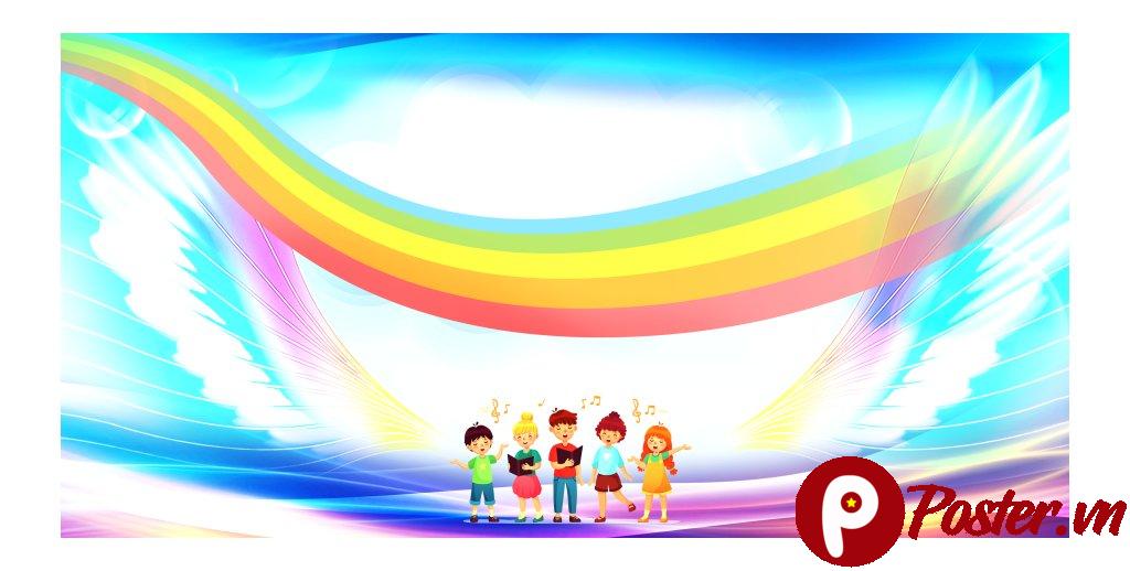 Hình ảnh trung tâm của mẫu vector là một nhóm trẻ em đáng yêu, đang đứng dưới một chiếc cầu vồng rực rỡ. Các em nhỏ được vẽ với phong cách hoạt hình ngộ nghĩnh, biểu cảm vui tươi, tạo cảm giác gần gũi và thân thiện. Cầu vồng với dải màu sắc tươi tắn không chỉ làm nền mà còn tượng trưng cho sự hy vọng, ước mơ và thế giới đầy màu sắc của tuổi thơ. Phía sau là những tia sáng lung linh, tạo hiệu ứng huyền ảo, thu hút mọi ánh nhìn.