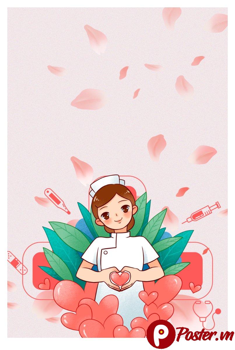 Mẫu vector này được thiết kế với hình ảnh trung tâm là một nữ y tá trẻ trung, thân thiện, đang ôm một trái tim đỏ thắm, tượng trưng cho sự tận tâm và lòng nhân ái của người thầy thuốc. Xung quanh là những cánh hoa hồng bay lượn nhẹ nhàng, tạo cảm giác thanh bình và trang trọng. Các biểu tượng y tế như nhiệt kế, ống tiêm, ống nghe được cách điệu tinh tế, làm nổi bật chủ đề mà không gây cảm giác khô khan.