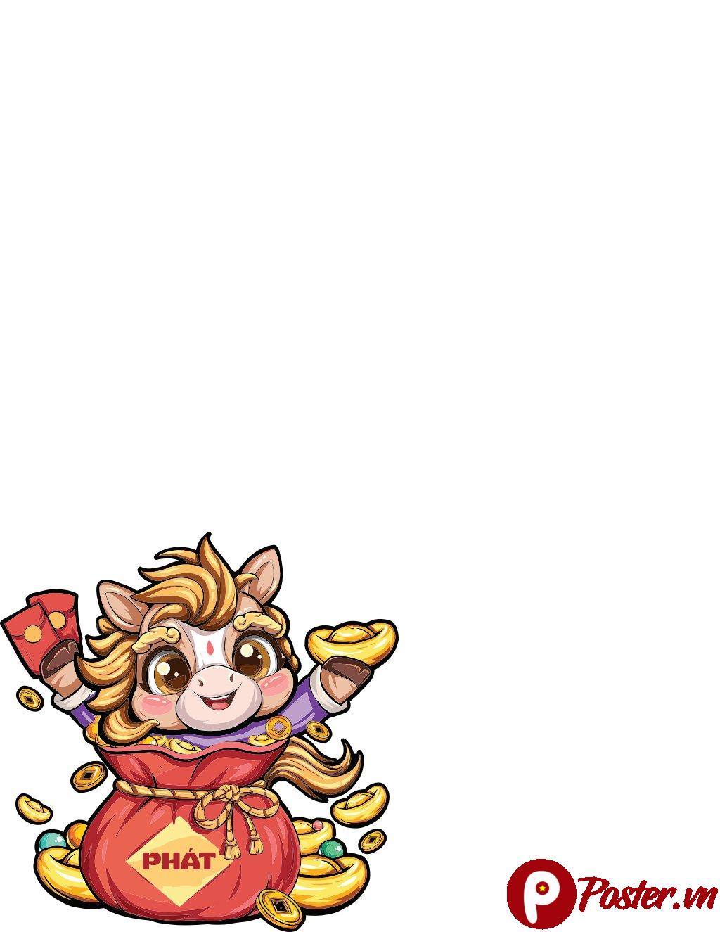 Với thiết kế tỉ mỉ, chú ngựa con hoạt hình này nổi bật với đôi mắt to tròn, biểu cảm rạng rỡ và bộ trang phục màu sắc tươi sáng. Chú đang ngập tràn trong kho báu là những thỏi vàng lấp lánh, đồng tiền xu cổ và đặc biệt là hai bao lì xì đỏ thắm, tất cả đều toát lên vẻ sung túc, đủ đầy. Đặc biệt, chữ “PHÁT” in đậm trên chiếc túi tiền màu đỏ càng nhấn mạnh ý nghĩa phát tài, phát lộc, phát triển không ngừng trong năm mới. Đây chắc chắn sẽ là linh vật mang lại may mắn, năng lượng tích cực và sự hứng khởi cho mọi dự án thiết kế của bạn, từ thiệp chúc mừng, banner quảng cáo, đến các ấn phẩm trang trí đậm chất Tết.