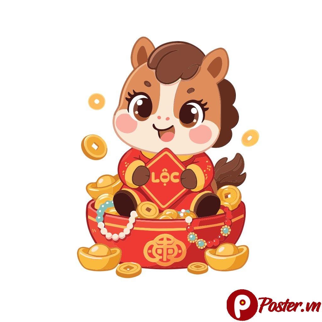 Chú ngựa thường tượng trưng cho sự kiên trì, mạnh mẽ và tốc độ. Khi kết hợp với phong cách chibi đáng yêu và chữ ‘LỘC’ cùng các yếu tố vàng bạc, hình ảnh chú ngựa con này mang ý nghĩa về một năm mới tràn đầy tài lộc, may mắn, sung túc và những khởi đầu thuận lợi, phát triển.