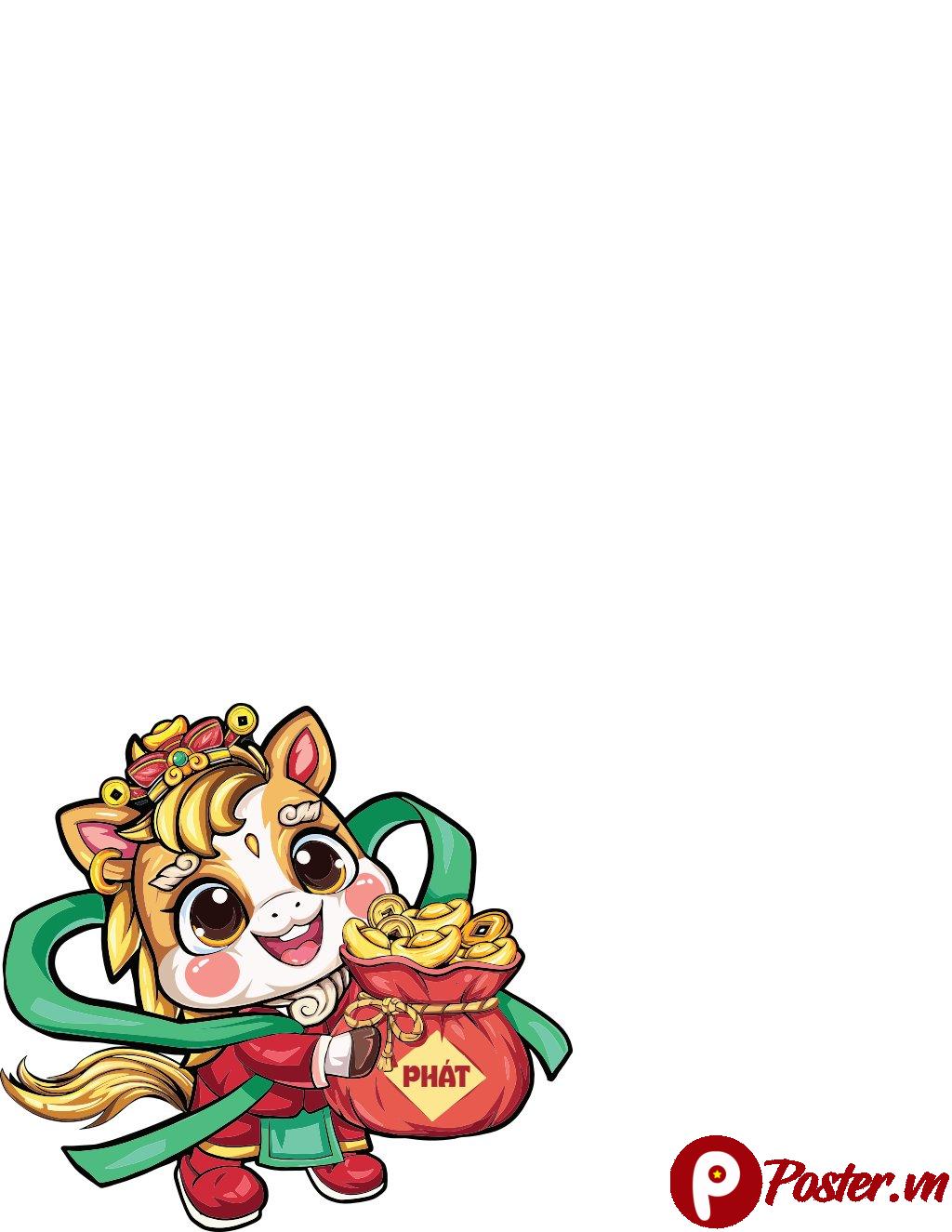 Tết Nguyên Đán luôn là dịp để mọi người trao gửi những lời chúc tốt đẹp nhất, và trong thiết kế đồ họa, việc sử dụng các biểu tượng may mắn, tài lộc là không thể thiếu. Hôm nay, Poster.vn hân hạnh giới thiệu đến bạn một tài nguyên thiết kế vô cùng đặc biệt: Linh vật ngựa hoạt hình chibi “PHÁT” tài lộc. Đây không chỉ là một hình ảnh đơn thuần, mà là một biểu tượng tràn đầy năng lượng tích cực, sự vui tươi và thịnh vượng, được thiết kế theo phong cách hoạt hình (cartoon) và chibi dễ thương, với đường nét rõ ràng, màu sắc tươi sáng và biểu cảm vui vẻ, thân thiện. Chú ngựa linh vật này, với tỷ lệ đầu lớn, mắt to tròn lấp lánh và nụ cười rạng rỡ, chắc chắn sẽ mang lại không khí lễ hội tưng bừng và lời chúc phúc tài lộc cho mọi dự án của bạn.