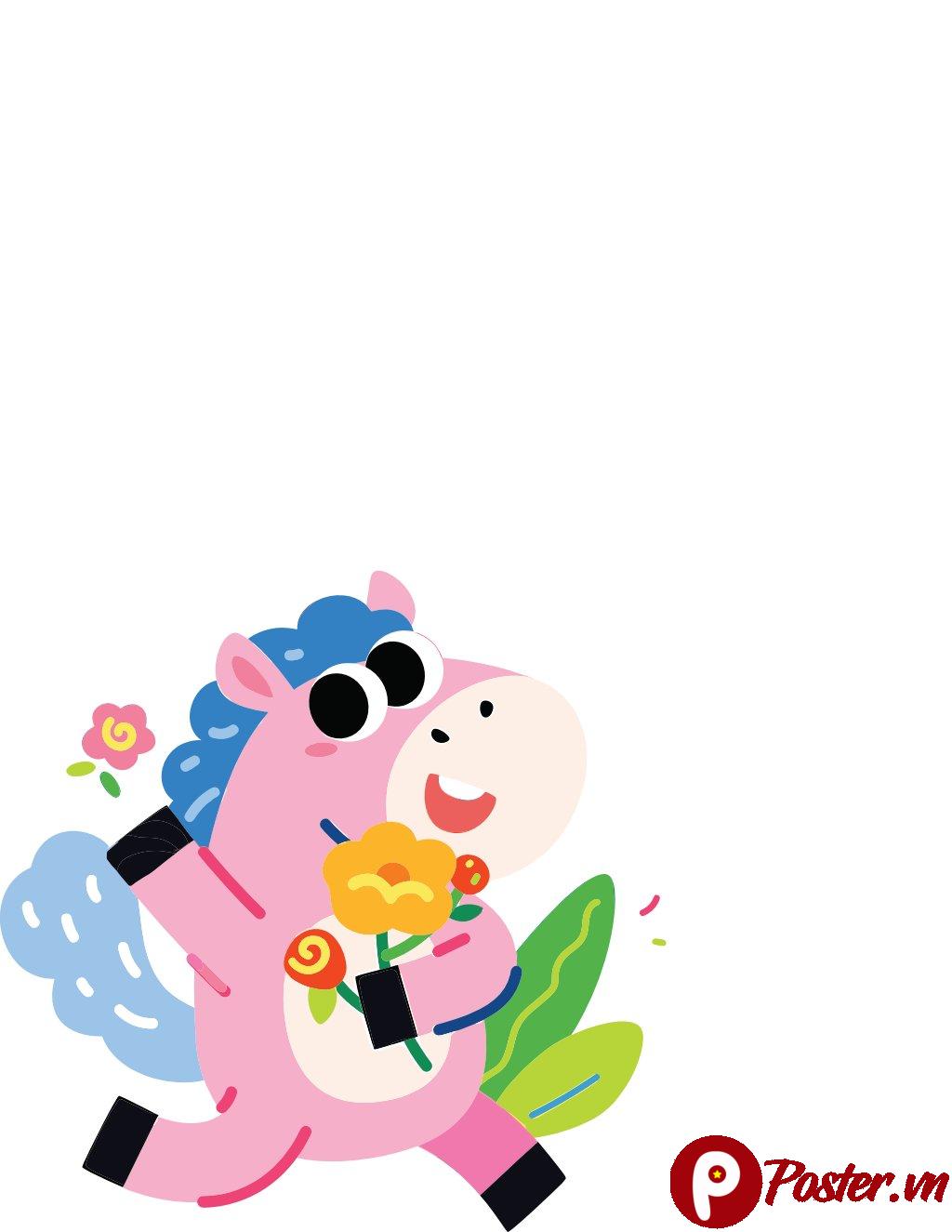 Hình ảnh trung tâm là một chú ngựa hoạt hình màu hồng nhạt, với bờm và đuôi xanh dương xoăn tít như những đám mây, đang trong tư thế chạy nhảy đầy hứng khởi. Đôi mắt to tròn, miệng cười tươi để lộ chiếc lưỡi đỏ, cùng với bó hoa rực rỡ sắc vàng cam và đỏ mà chú đang ôm, tất cả tạo nên một tổng thể vô cùng thu hút và thân thiện. Đây không chỉ là một hình ảnh đơn thuần; đó là một câu chuyện về sự vui vẻ, năng động và tình yêu thiên nhiên được gói gọn trong từng nét vẽ. File vector này là lựa chọn lý tưởng để thêm sự sinh động và đáng yêu vào các ấn phẩm thiết kế, từ sản phẩm dành cho trẻ em đến các chiến dịch marketing vui tươi.