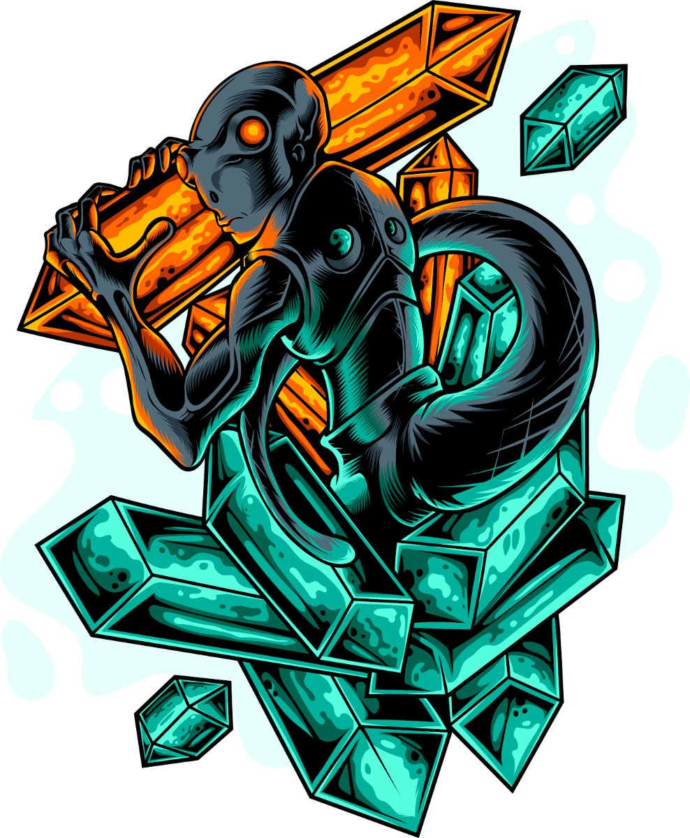 Hình ảnh được thiết kế theo phong cách đồ họa vector, với các đường nét sắc sảo, màu sắc tươi sáng và độ chi tiết cao. Sự kết hợp giữa tông màu tối của sinh vật và màu sắc rực rỡ của pha lê tạo nên một hiệu ứng thị giác mạnh mẽ, phù hợp với nhiều loại hình dự án sáng tạo. Phong cách này đặc biệt phù hợp cho các dự án liên quan đến khoa học viễn tưởng, game, truyện tranh, hoặc các ấn phẩm quảng cáo muốn tạo điểm nhấn khác biệt.