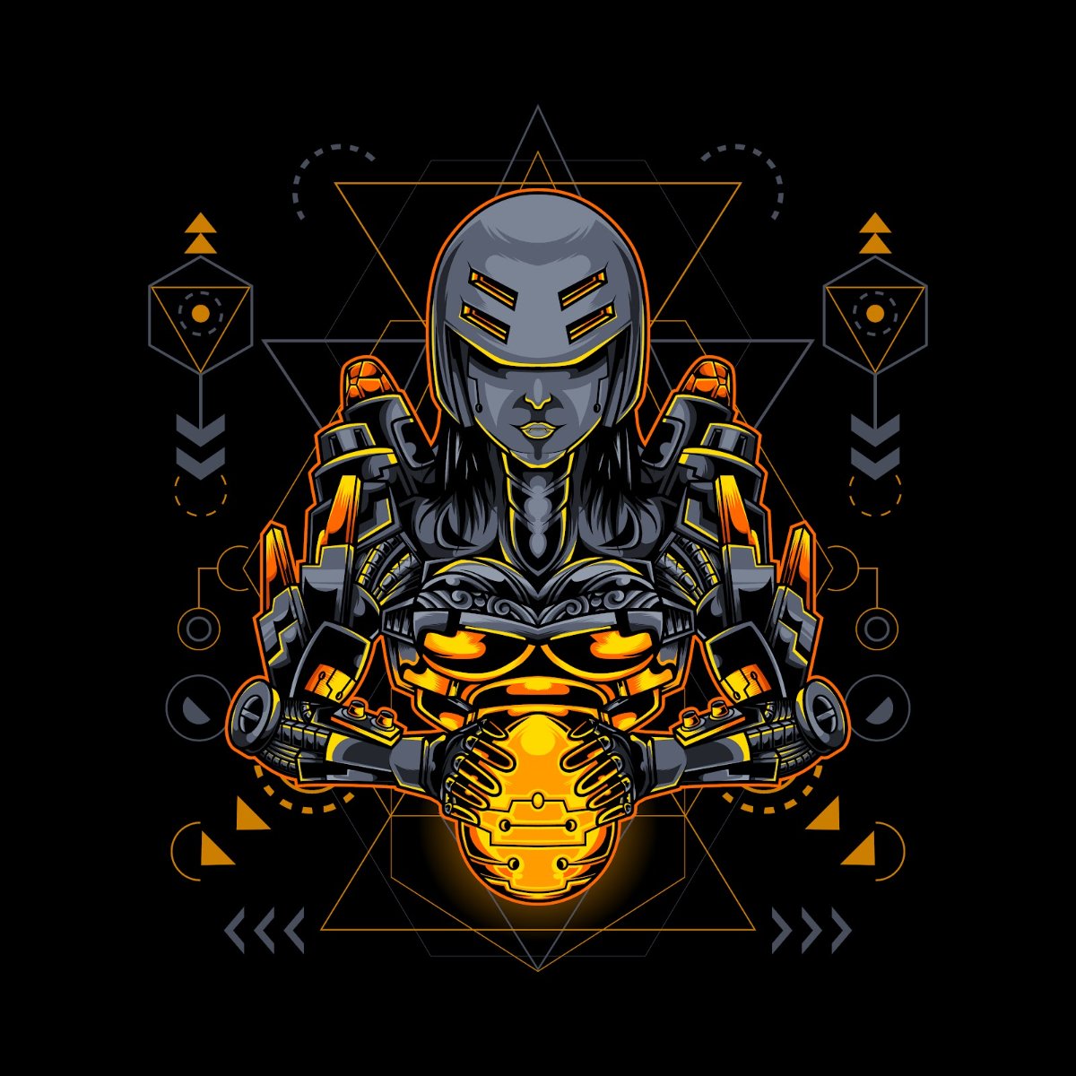 Mẫu vector nữ chiến binh cyberpunk này được thiết kế với sự tỉ mỉ và sáng tạo, kết hợp hài hòa giữa yếu tố con người và máy móc. Hình ảnh trung tâm là một nữ chiến binh mạnh mẽ, khoác lên mình bộ giáp công nghệ cao, với những chi tiết cơ khí phức tạp và ánh sáng neon rực rỡ đặc trưng của thể loại cyberpunk. Màu sắc chủ đạo là sự kết hợp giữa gam tối của kim loại và những điểm nhấn vàng cam phát sáng, tạo nên một hiệu ứng thị giác cuốn hút và đầy kịch tính.
