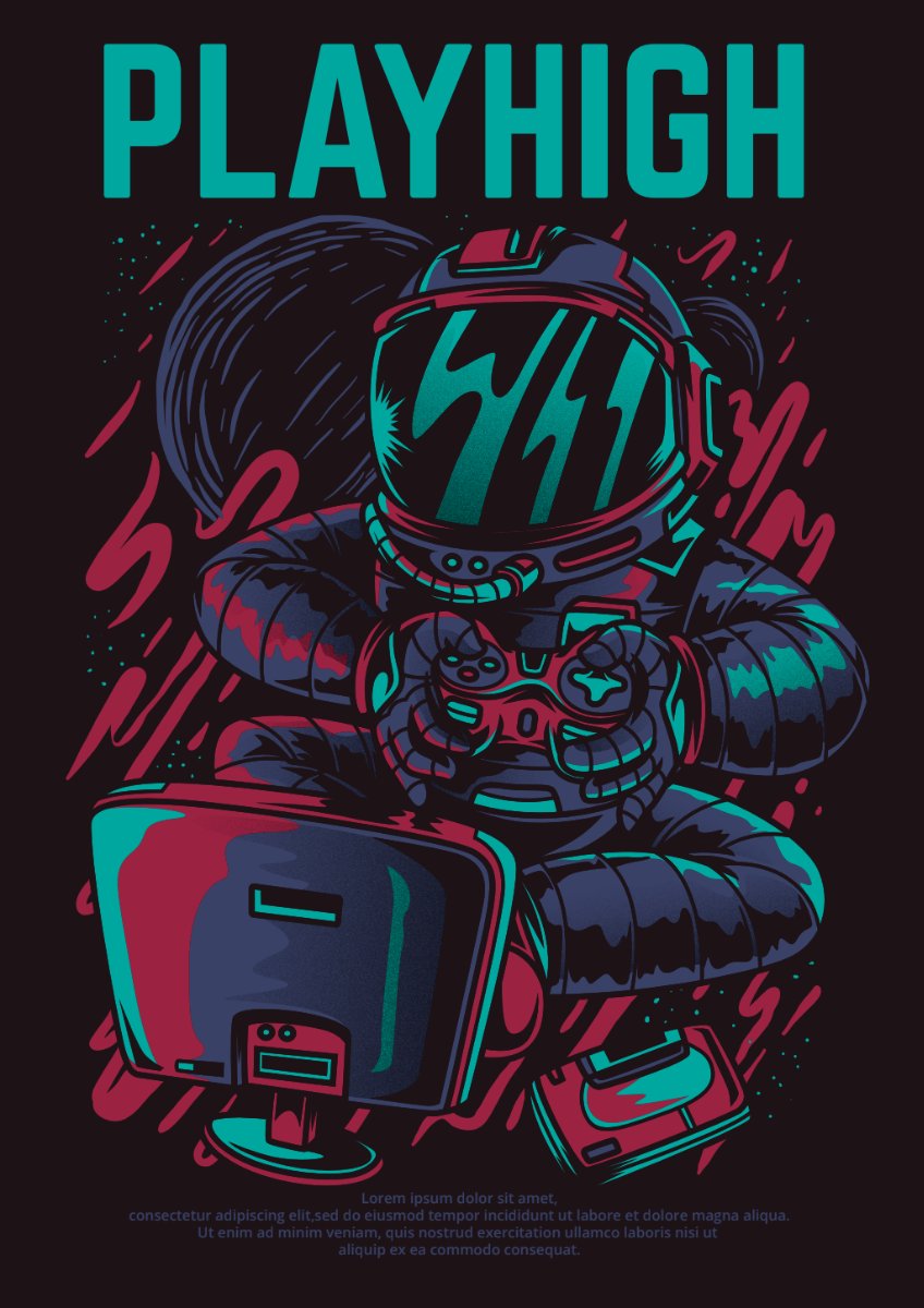 Mẫu vector này khắc họa một phi hành gia đang say mê với trò chơi điện tử, với bộ đồ không gian và chiếc tay cầm game quen thuộc. Điểm nhấn là dòng chữ “PLAYHIGH” được thiết kế cách điệu, tạo nên một tổng thể hài hòa và đầy cá tính. Màu sắc chủ đạo là xanh ngọc và hồng neon trên nền tối, mang lại cảm giác hiện đại, năng động nhưng vẫn giữ được nét cổ điển đặc trưng của phong cách retro.