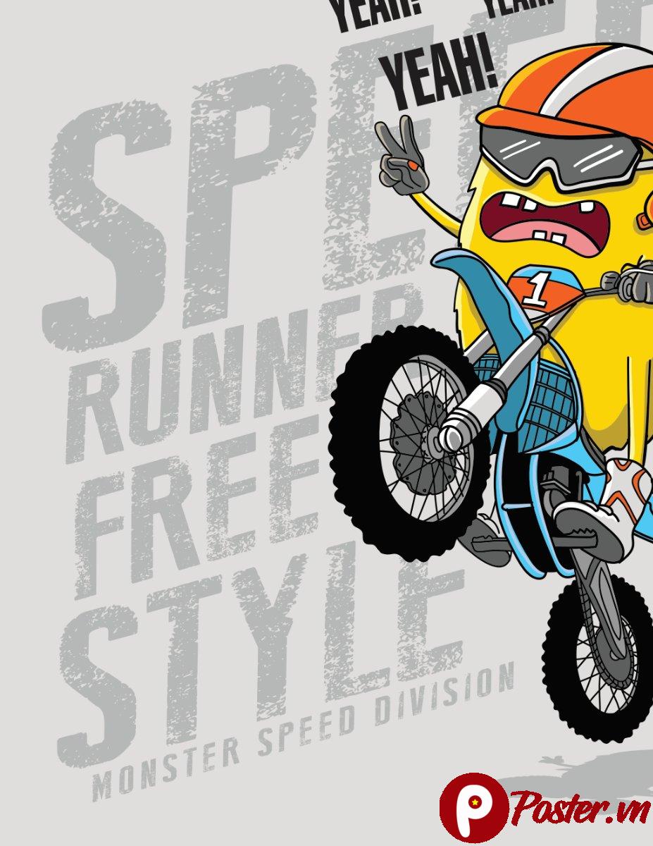 Mẫu vector này nổi bật với hình ảnh một quái vật màu vàng cam đáng yêu, đội mũ bảo hiểm và kính râm sành điệu, đang điều khiển chiếc xe mô tô địa hình màu xanh dương. Tư thế “bốc đầu” đầy phấn khích cùng biểu cảm “Yeah! Yeah!” tạo nên một tổng thể vui nhộn và tràn đầy năng lượng. Phía sau là dòng chữ “SPEED RUNNER FREE STYLE MONSTER SPEED DIVISION” được thiết kế theo phong cách grunge, tăng thêm vẻ bụi bặm và cá tính cho tác phẩm.