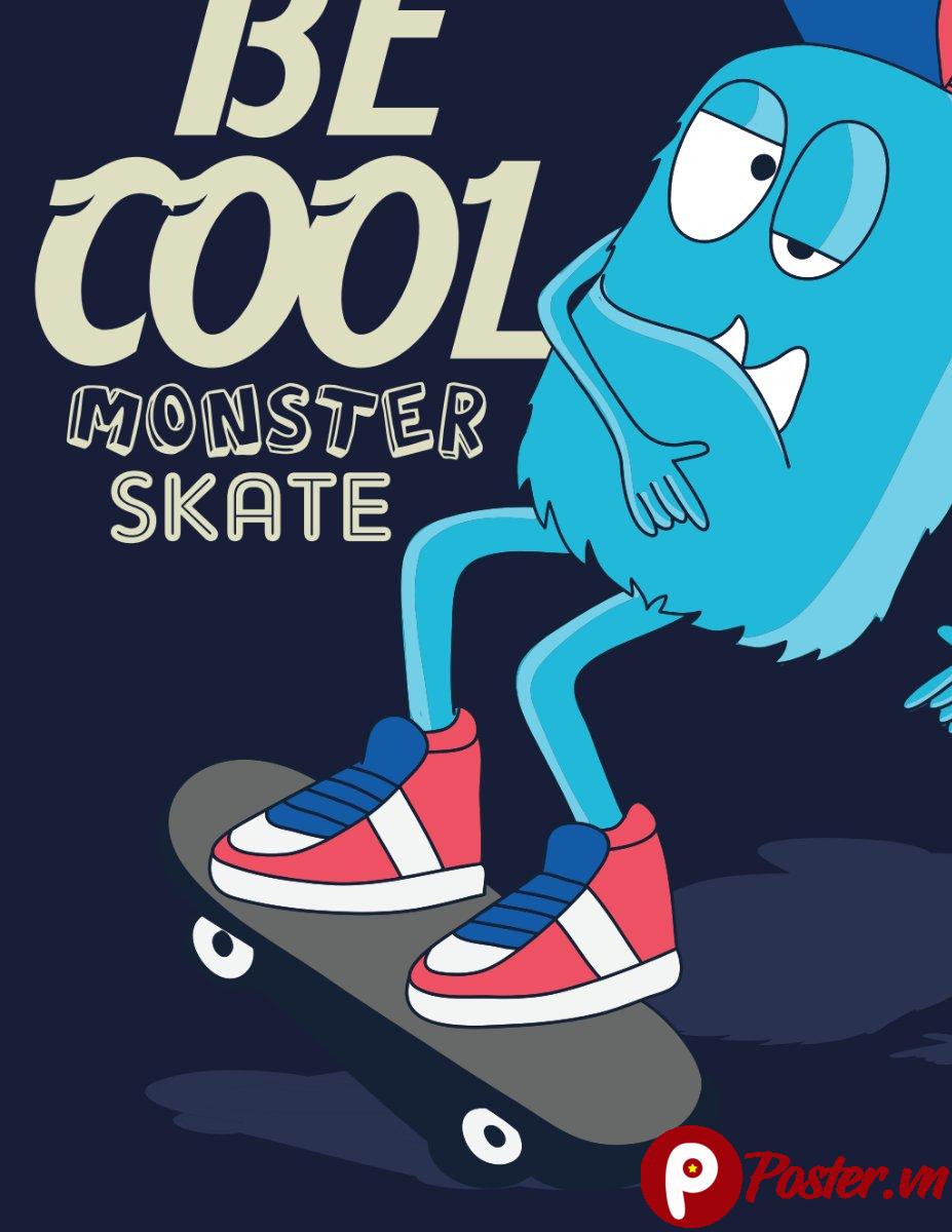 Mẫu vector này nổi bật với hình ảnh một chú quái vật màu xanh dương ngộ nghĩnh, đôi mắt to tròn và nụ cười tinh quái. Điều làm nên sự đặc biệt của thiết kế là chú quái vật đang tự tin lướt trên ván trượt, với đôi giày thể thao đỏ trắng nổi bật. Phía trên là dòng chữ “BE COOL” và “MONSTER SKATE” được thiết kế theo phong cách graffiti, tạo cảm giác mạnh mẽ và phóng khoáng. Nền tối giúp làm nổi bật nhân vật chính, đồng thời tăng thêm vẻ “cool ngầu” cho tổng thể.
