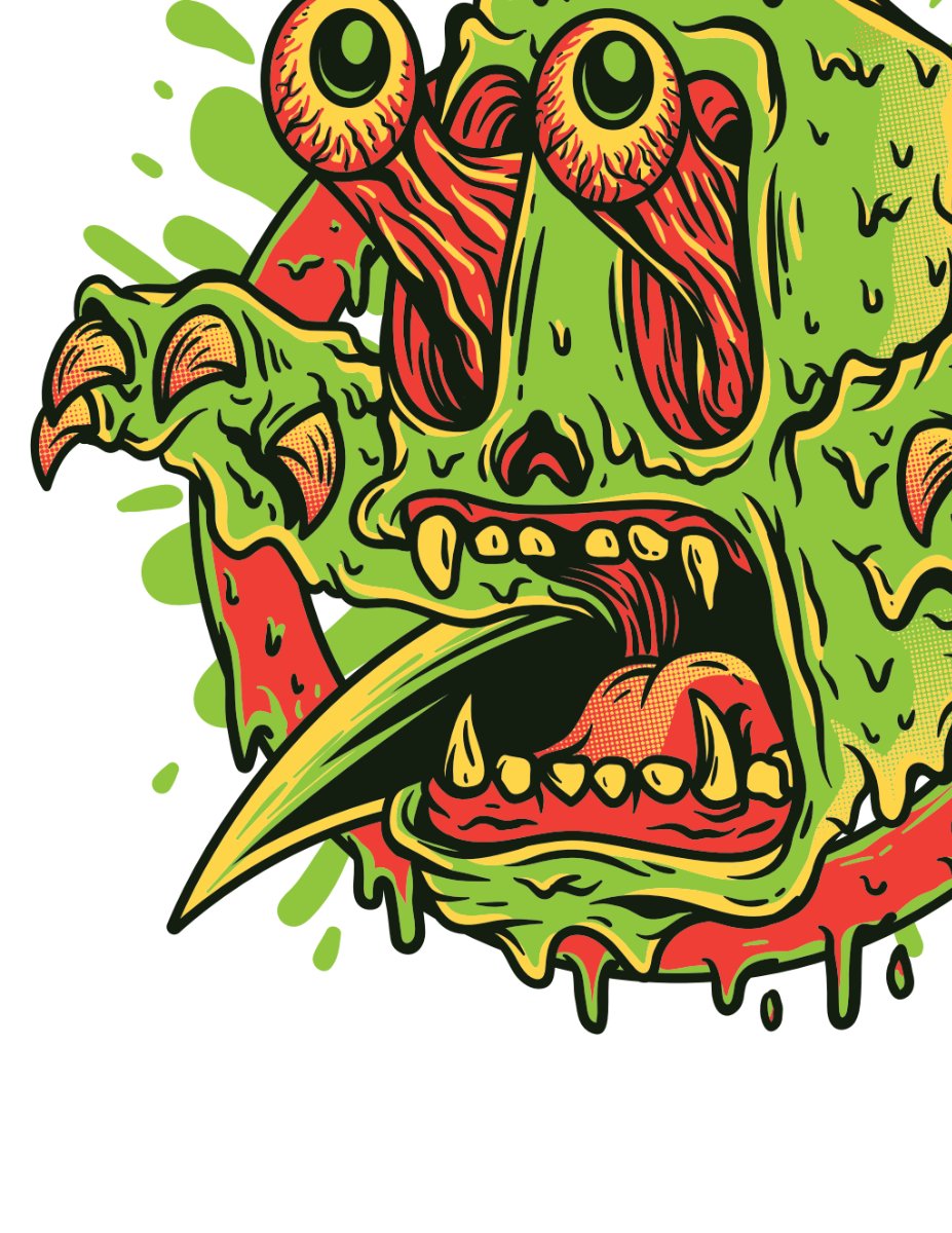 - Thiết kế độc đáo và chi tiết: Hình ảnh quái vật được vẽ với phong cách hoạt hình kinh dị, có đôi mắt lồi, hàm răng sắc nhọn và chiếc lưỡi dài, tạo cảm giác ghê rợn nhưng vẫn có nét nghệ thuật. Các chi tiết như mảng da sần sùi, vết máu và nước dãi được thể hiện rất tỉ mỉ, mang lại sự sống động cho tác phẩm.