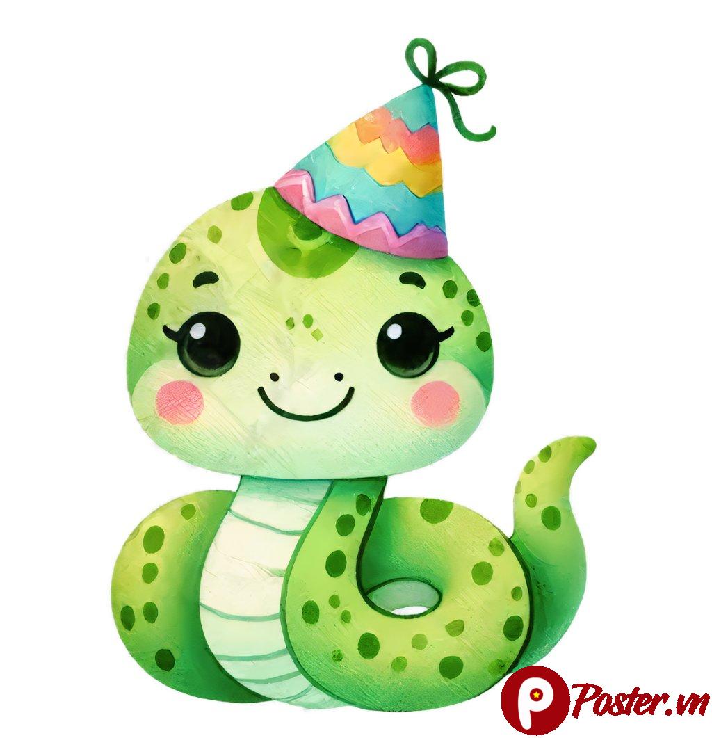 - Thiết kế đáng yêu: Chú rắn được vẽ với đôi mắt to tròn, nụ cười thân thiện và chiếc mũ sinh nhật đầy màu sắc, tạo cảm giác vui tươi, hồn nhiên.