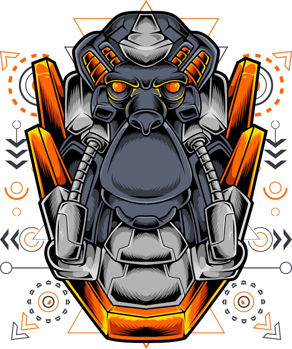 Vector Robot Khỉ Đột Đồ Họa. Khám phá “Asset 1205” – vector robot khỉ đột mạnh mẽ, thiết kế ấn tượng với phong cách đồ họa cơ khí, màu sắc cam và xám nổi bật. Hoàn hảo cho các dự án game, áo thun, poster và nhiều ứng dụng sáng tạo khác.