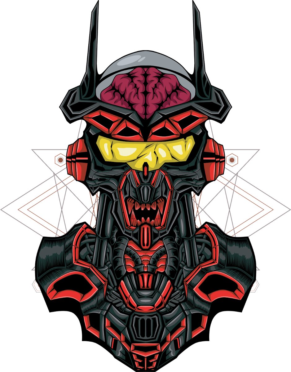 Vector Robot Não Bộ Đỏ Đen. Khám phá vector robot não bộ đỏ đen độc đáo tại Poster.vn. Thiết kế mạnh mẽ, chi tiết ấn tượng, lý tưởng cho các dự án đồ họa game, áo thun, hoặc ấn phẩm quảng cáo mang phong cách khoa học viễn tưởng.