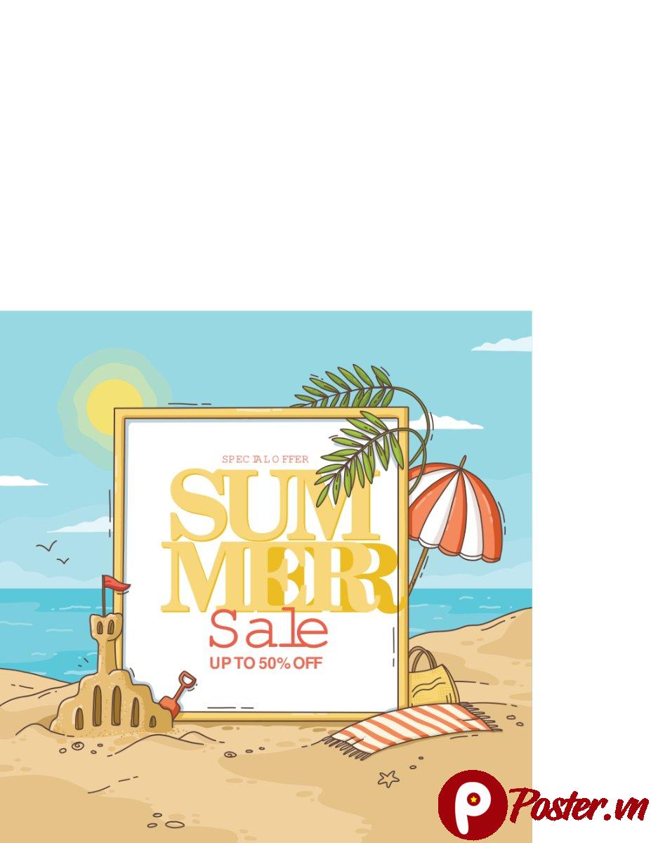 Mẫu vector sale hè này nổi bật với khung hình trung tâm chứa dòng chữ “SUMMER SALE UP TO 50% OFF”, được bao quanh bởi các yếu tố đặc trưng của mùa hè như cây cọ, ô dù, lâu đài cát và khăn trải bãi biển. Bầu trời xanh trong, bãi biển vàng óng và mặt trời rực rỡ tạo nên một tổng thể hài hòa, tươi mới và đầy sức sống. Đây là lựa chọn lý tưởng cho các chiến dịch quảng cáo giảm giá, khuyến mãi mùa hè của các cửa hàng thời trang, du lịch, mỹ phẩm, hay bất kỳ ngành hàng nào muốn tận dụng không khí sôi động của mùa hè.