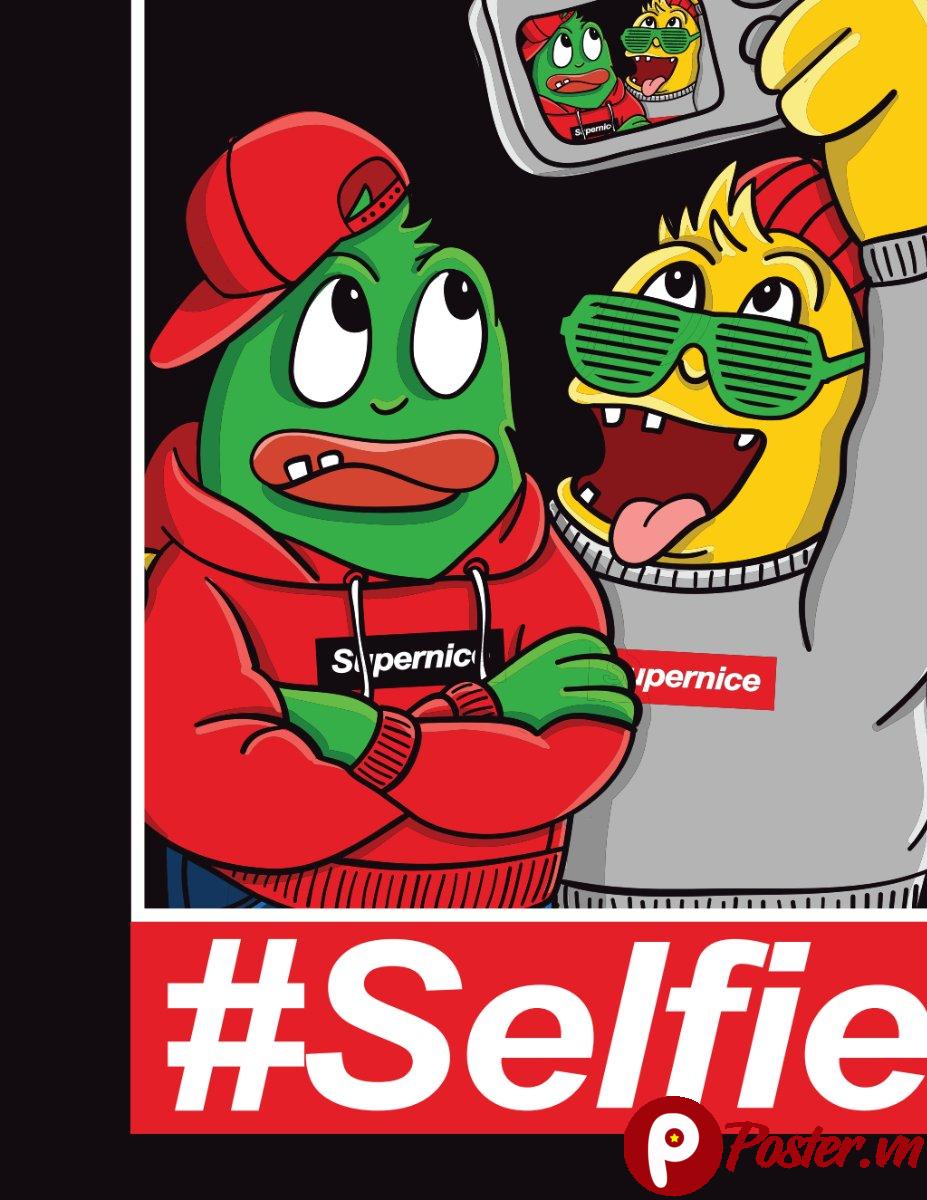 Tài nguyên này nổi bật với hình ảnh hai chú ếch hoạt hình đang chụp ảnh selfie, mang đến một không khí vui tươi, trẻ trung và đầy năng lượng. Một chú ếch đội mũ lưỡi trai đỏ, mặc áo hoodie, tạo dáng cool ngầu. Chú ếch còn lại đeo kính râm sành điệu, miệng cười toe toét, thể hiện sự phấn khích tột độ. Chi tiết hashtag #Selfie ở phía dưới càng làm tăng thêm tính hiện đại và phù hợp với xu hướng mạng xã hội.
