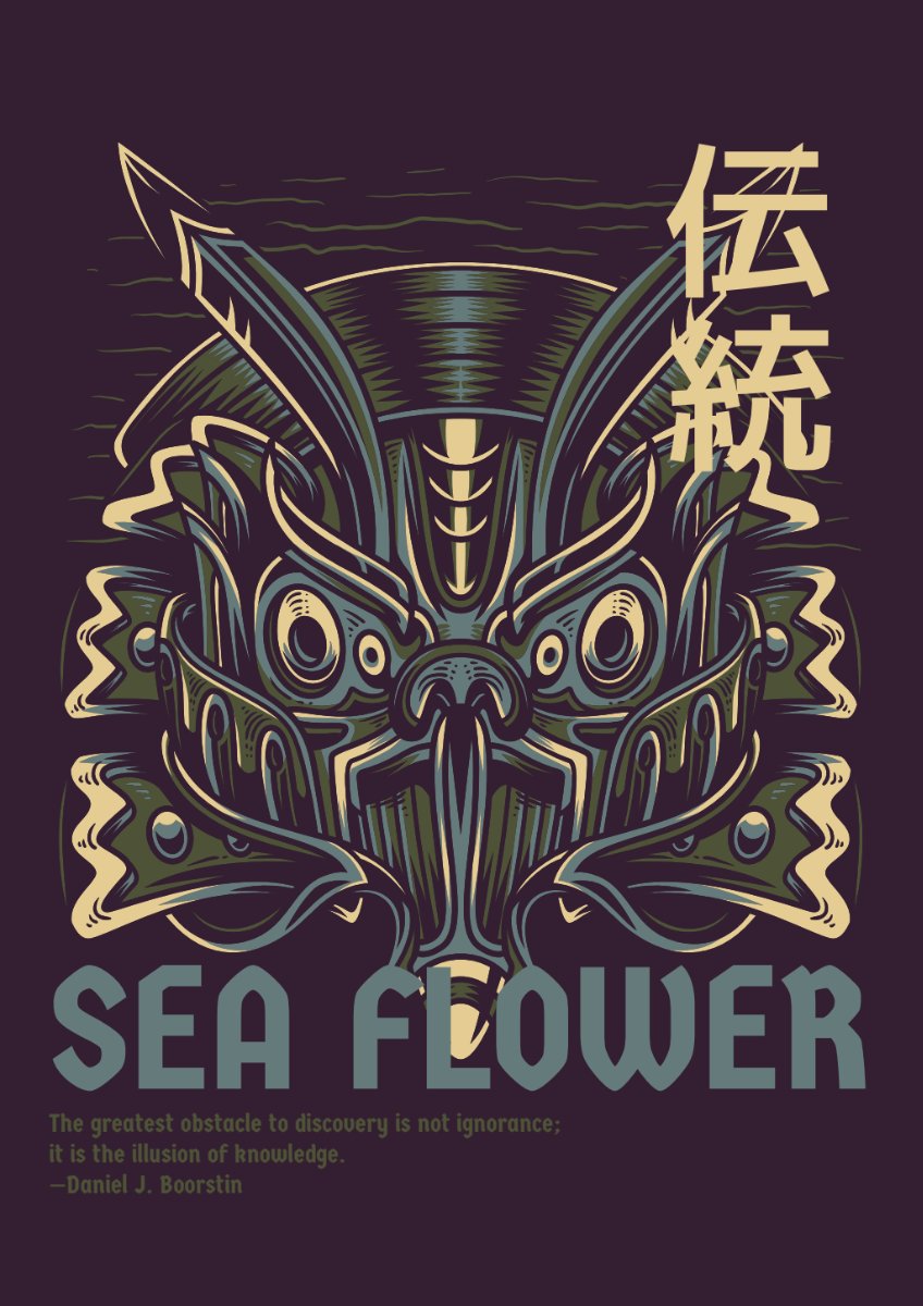 Mẫu vector Zombie 306 không chỉ là một hình ảnh đơn thuần mà còn là một câu chuyện được kể qua từng chi tiết. Với phong cách minh họa mạnh mẽ, hình ảnh trung tâm là một chiếc mặt nạ hoặc mũ giáp chiến binh mang hơi hướng samurai, nhưng lại được cách điệu theo phong cách zombie hoặc quái vật, tạo nên sự bí ẩn và cuốn hút. Phía trên là các ký tự tiếng Nhật, tăng thêm vẻ truyền thống và độc đáo cho thiết kế. Dòng chữ “SEA FLOWER” cùng câu nói sâu sắc của Daniel J. Boorstin làm cho tác phẩm trở nên có chiều sâu và ý nghĩa hơn.
