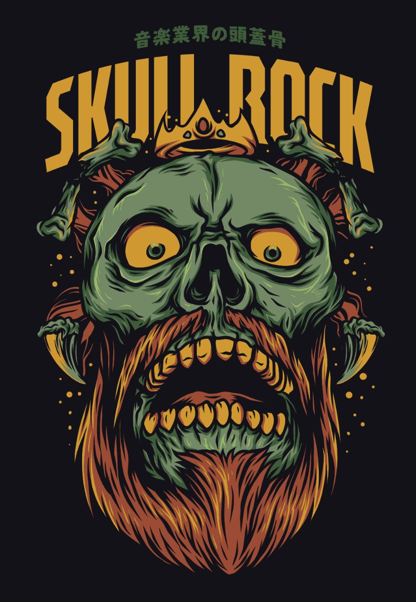 Hình ảnh zombie với vương miện, bộ râu rậm rạp và ánh mắt đầy ám ảnh được thể hiện một cách sống động. Mỗi chi tiết, từ đường nét khuôn mặt, hàm răng sắc nhọn đến kết cấu bộ râu, đều được chăm chút tỉ mỉ, tạo nên một tổng thể mạnh mẽ và cuốn hút. Phong cách minh họa theo hướng rock, gothic kết hợp với yếu tố kinh dị tạo nên sự khác biệt rõ rệt.