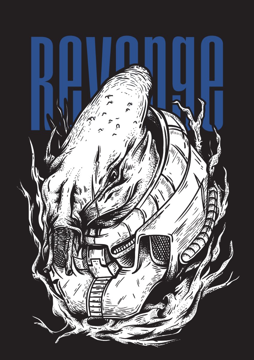 Điểm nhấn của thiết kế nằm ở chiếc mũ bảo hiểm bị phá hủy, lộ ra phần đầu zombie ghê rợn, cùng với dòng chữ “REVENGE” (Trả thù) màu xanh nổi bật phía trên. Bố cục tổng thể được bao quanh bởi những cành cây khô héo, càng làm tăng thêm không khí u ám và kinh dị. Đây không chỉ là một hình ảnh, mà là một câu chuyện được kể qua từng nét vẽ.